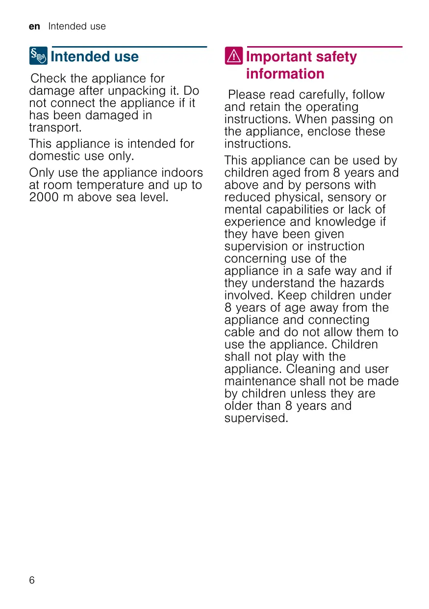8 Intended use Check the appliance for damage after unpacking it. Do not connect the appliance if it has been damaged in transport. This appliance is intended for domestic use only. Only use the appliance indoors at room temperature and up to 2000 m above sea level.