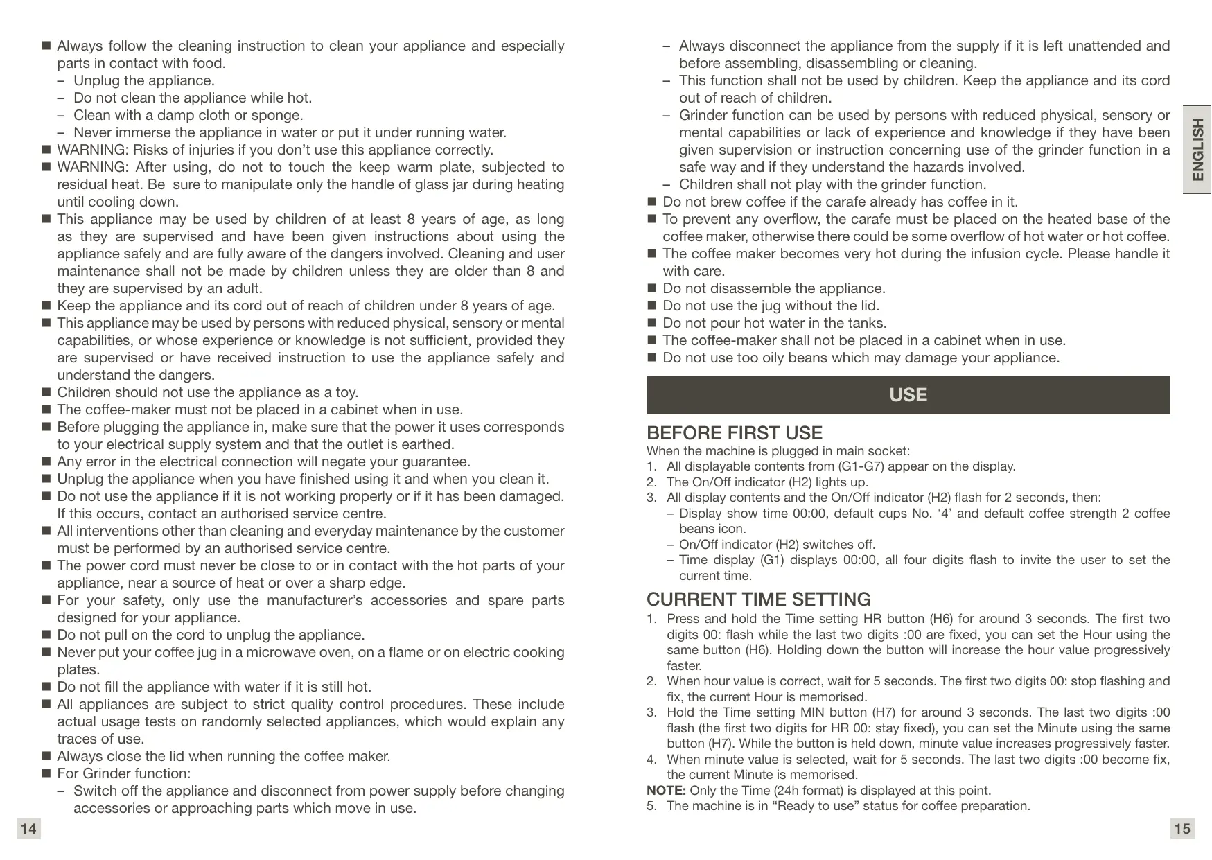 – This function shall not be used by children. Keep the appliance and its cord out of reach of children. – Grinder function can be used by persons with reduced physical, sensory or mental capabilities or lack of experience and knowledge if they have been given supervision or instruction concerning use of the grinder function in a safe way and if they understand the hazards involved. – Children shall not play with the grinder function. Do not brew coffee if the carafe already has coffee in it. To prevent any overflow, the carafe must be placed on the heated base of the coffee maker, otherwise there could be some overflow of hot water or hot coffee. The coffee maker becomes very hot during the infusion cycle. Please handle it with care. Do not disassemble the appliance. Do not use the jug without the lid. Do not pour hot water in the tanks. The coffee-maker shall not be placed in a cabinet when in use. Do not use too oily beans which may damage your appliance.