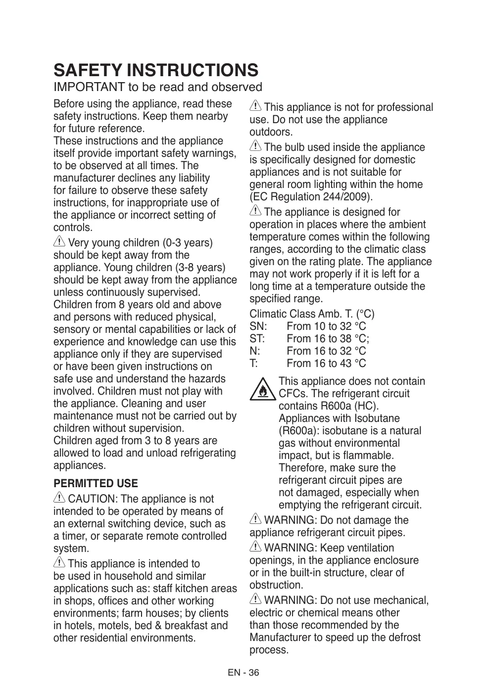 The bulb used inside the appliance is specifically designed for domestic appliances and is not suitable for general room lighting within the home (EC Regulation 244/2009). The appliance is designed for operation in places where the ambient temperature comes within the following ranges, according to the climatic class given on the rating plate. The appliance may not work properly if it is left for a long time at a temperature outside the specified range. Climatic Class Amb. T. (°C) SN: From 10 to 32 °C ST: From 16 to 38 °C; N: From 16 to 32 °C T: From 16 to 43 °C This appliance does not contain CFCs. The refrigerant circuit contains R600a (HC). Appliances with Isobutane (R600a): isobutane is a natural gas without environmental impact, but is flammable. Therefore, make sure the refrigerant circuit pipes are not damaged, especially when emptying the refrigerant circuit. WARNING: Do not damage the appliance refrigerant circuit pipes. WARNING: Keep ventilation openings, in the appliance enclosure or in the built-in structure, clear of obstruction. WARNING: Do not use mechanical, electric or chemical means other than those recommended by the Manufacturer to speed up the defrost process.