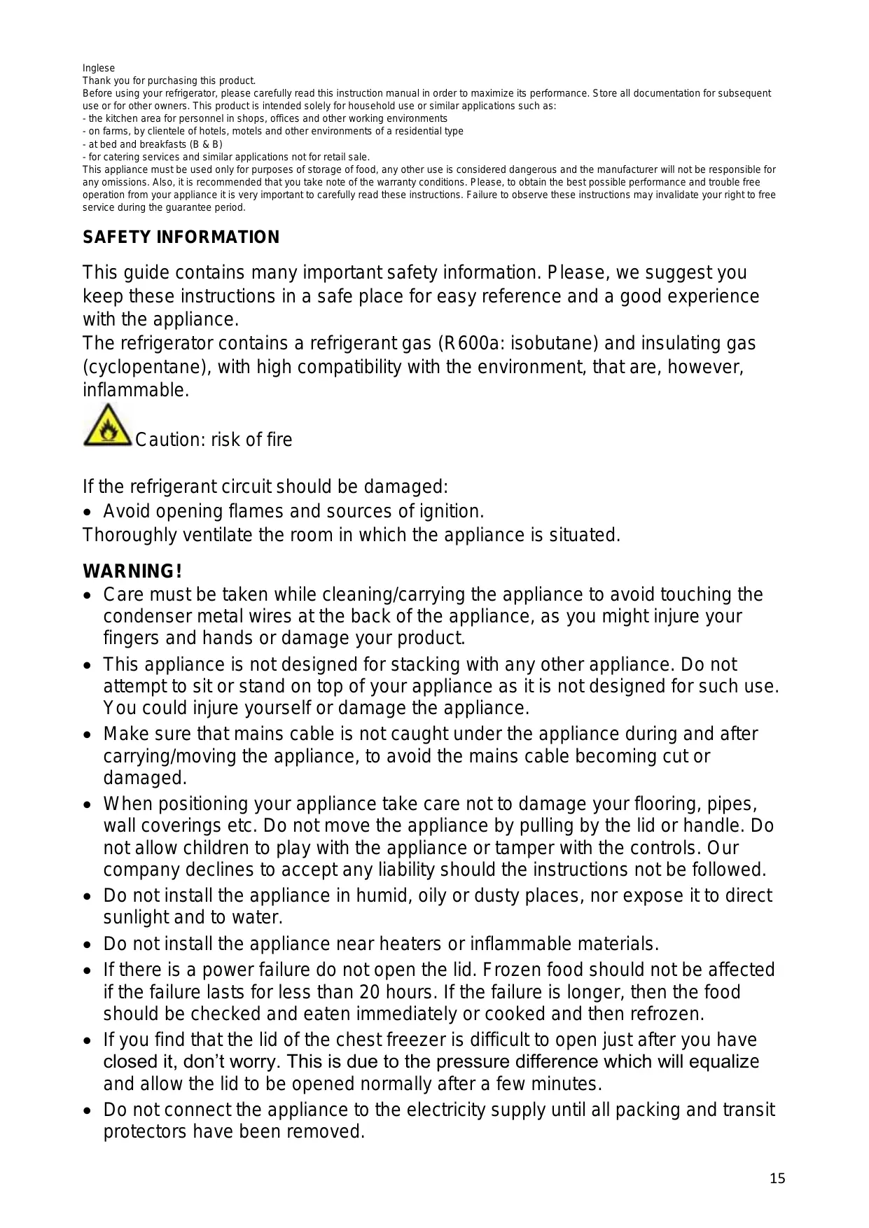 Inglese Thank you for purchasing this product. Before using your refrigerator, please carefully read this instruction manual in order to maximize its performance. Store all documentation for subsequent use or for other owners. This product is intended solely for household use or similar applications such as: - the kitchen area for personnel in shops, offices and other working environments - on farms, by clientele of hotels, motels and other environments of a residential type - at bed and breakfasts (B & B) - for catering services and similar applications not for retail sale. This appliance must be used only for purposes of storage of food, any other use is considered dangerous and the manufacturer will not be responsible for any omissions. Also, it is recommended that you take note of the warranty conditions. Please, to obtain the best possible performance and trouble free operation from your appliance it is very important to carefully read these instructions. Failure to observe these instructions may invalidate your right to free service during the guarantee period. SAFETY INFORMATION This guide contains many important safety information. Please, we suggest you keep these instructions in a safe place for easy reference and a good experience with the appliance. The refrigerator contains a refrigerant gas (R600a: isobutane) and insulating gas (cyclopentane), with high compatibility with the environment, that are, however, inflammable. Caution: risk of fire If the refrigerant circuit should be damaged: