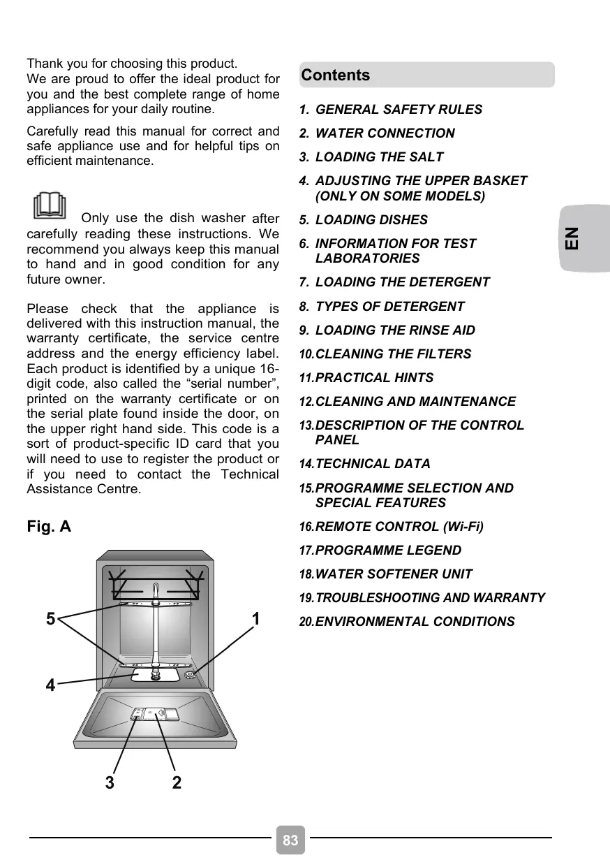 7. REMPLISSAGE DU DÉTERGENT 9. REMPLISSAGE DU PRODUIT DE RINÇAGE 10.NETTOYAGE DES FILTRES 11.CONSEILS PRATIQUES 12.ENTRETIEN ET NETTOYAGE 13.DESCRIPTION DU PANNEAU DE COMMANDE 14.DONNÉES TECHNIQUES 15.SÉLECTION DU PROGRAMME ET FONCTIONS SPÉCIALES 16.CONTRÔLE À DISTANCE (Wi-Fi) 17.LÉGENDE DES PROGRAMMES 18.UNITÉ ADOUCISSEUR DE L’EAU 19.DÉPANNAGE ET GARANTIES 20.CONDITIONS AMBIANTES