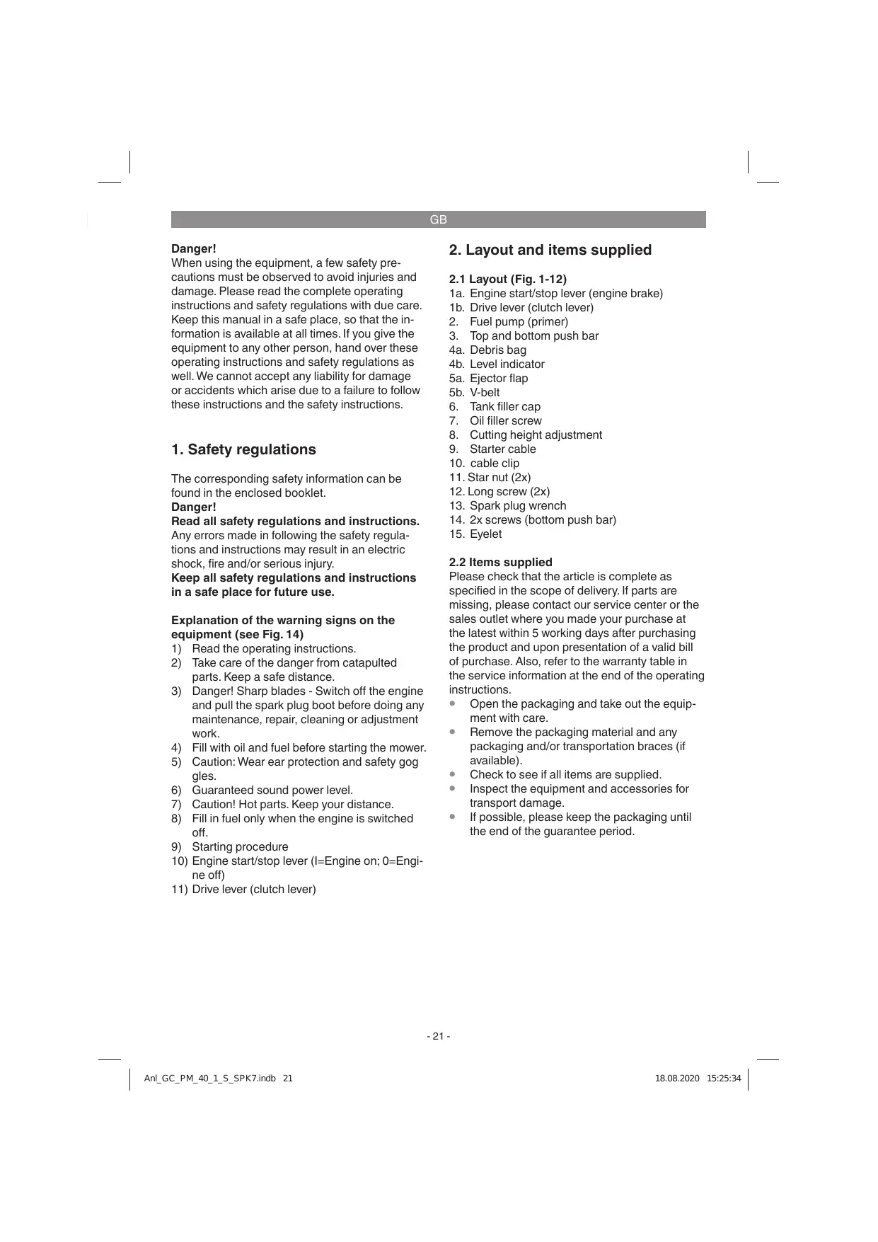2.1 Layout (Fig. 1-12) 1a. Engine start/stop lever (engine brake) 1b. Drive lever (clutch lever) 2. Fuel pump (primer) 3. Top and bottom push bar 4a. Debris bag 4b. Level indicator 5a. Ejector flap 5b. V-belt 6. Tank filler cap 7. Oil filler screw 8. Cutting height adjustment 9. Starter cable 10. cable clip 11. Star nut (2x) 12. Long screw (2x) 13. Spark plug wrench 14. 2x screws (bottom push bar) 15. Eyelet 2.2 Items supplied Please check that the article is complete as specified in the scope of delivery. If parts are missing, please contact our service center or the sales outlet where you made your purchase at the latest within 5 working days after purchasing the product and upon presentation of a valid bill of purchase. Also, refer to the warranty table in the service information at the end of the operating instructions. • Open the packaging and take out the equipment with care. • Remove the packaging material and any packaging and/or transportation braces (if available). • Check to see if all items are supplied. • Inspect the equipment and accessories for transport damage. • If possible, please keep the packaging until the end of the guarantee period.