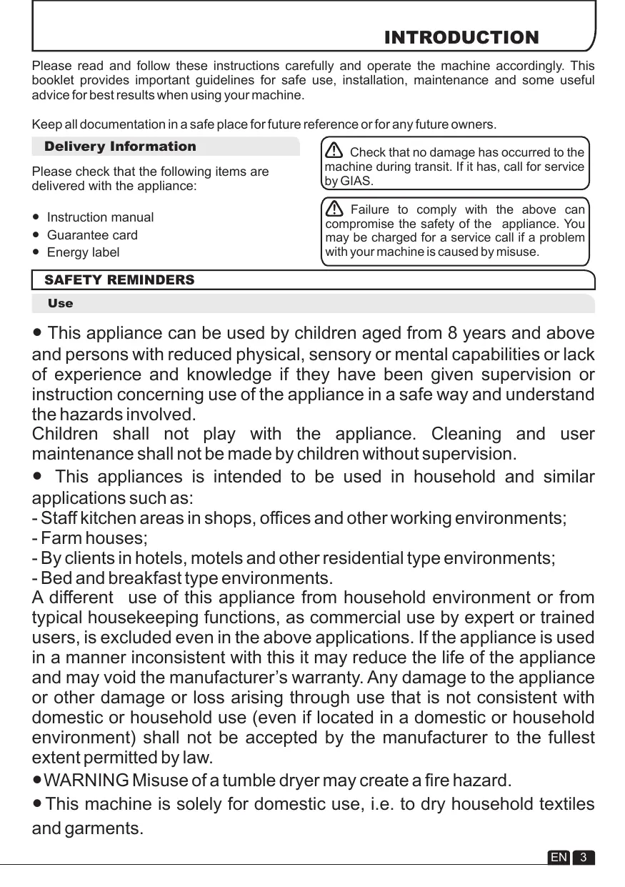 INTRODUCTION Please read and follow these instructions carefully and operate the machine accordingly. This booklet provides important guidelines for safe use, installation, maintenance and some useful advice for best results when using your machine. Keep all documentation in a safe place for future reference or for any future owners. Delivery Information Please check that the following items are delivered with the appliance: Check that no damage has occurred to the machine during transit. If it has, call for service by GIAS. ● Instruction manual ● Guarantee card ● Energy label Failure to comply with the above can compromise the safety of the appliance. You may be charged for a service call if a problem with your machine is caused by misuse. ● This appliance can be used by children aged from 8 years and above and persons with reduced physical, sensory or mental capabilities or lack of experience and knowledge if they have been given supervision or instruction concerning use of the appliance in a safe way and understand the hazards involved. Children shall not play with the appliance. Cleaning and user maintenance shall not be made by children without supervision. ● This appliances is intended to be used in household and similar applications such as: - Staff kitchen areas in shops, offices and other working environments; - Farm houses; - By clients in hotels, motels and other residential type environments; - Bed and breakfast type environments. A different use of this appliance from household environment or from typical housekeeping functions, as commercial use by expert or trained users, is excluded even in the above applications. If the appliance is used in a manner inconsistent with this it may reduce the life of the appliance and may void the manufacturer’s warranty. Any damage to the appliance or other damage or loss arising through use that is not consistent with domestic or household use (even if located in a domestic or household environment) shall not be accepted by the manufacturer to the fullest extent permitted by law. ● WARNING Misuse of a tumble dryer may create a fire hazard. ● This machine is solely for domestic use, i.e. to dry household textiles and garments.