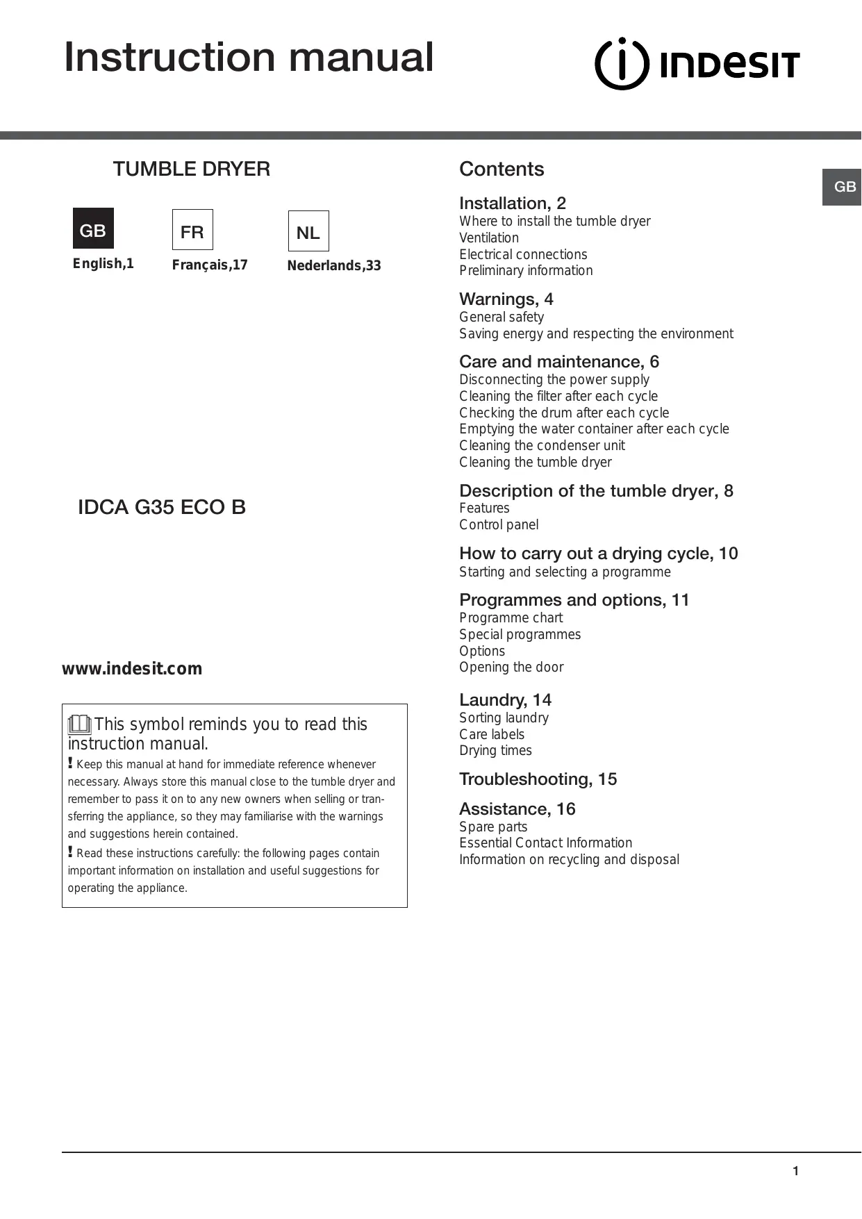 Download the instructions for your Tumble drier in PDF format for free! Find your manual IDCA G35 - INDESIT and take your electronic device back in hand. On this page are published all the documents necessary for the use of your device. IDCA G35 by INDESIT.