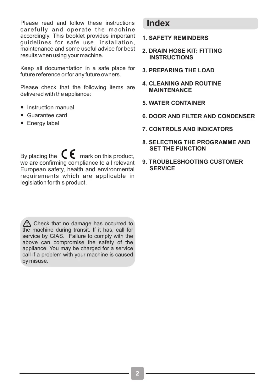 9. TROUBLESHOOTING CUSTOMER SERVICE Check that no damage has occurred to the machine during transit. If it has, call for service by GIAS. Failure to comply with the above can compromise the safety of the appliance. You may be charged for a service call if a problem with your machine is caused by misuse.