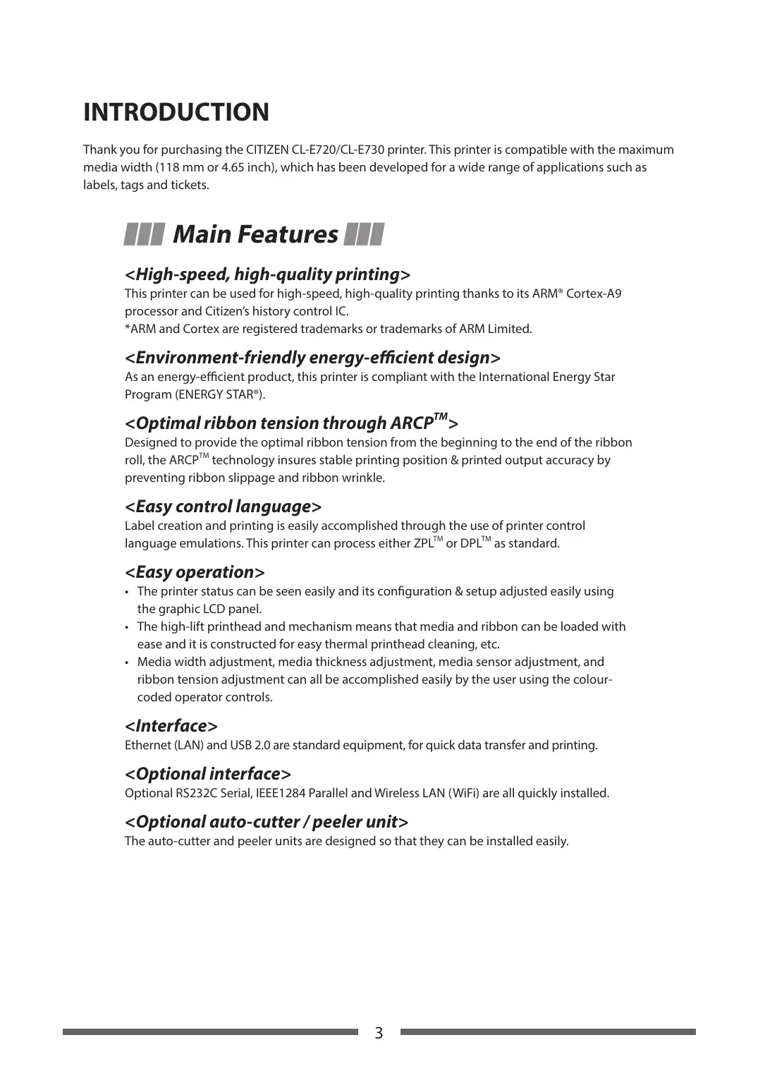 INTRODUCTION Thank you for purchasing the CITIZEN CL-E720/CL-E730 printer. This printer is compatible with the maximum media width (118 mm or 4.65 inch), which has been developed for a wide range of applications such as labels, tags and tickets. ■■■ Main Features ■■■ <High-speed, high-quality printing> This printer can be used for high-speed, high-quality printing thanks to its ARM® Cortex-A9 processor and Citizen’s history control IC. *ARM and Cortex are registered trademarks or trademarks of ARM Limited. <Environment-friendly energy-efficient design> As an energy-efficient product, this printer is compliant with the International Energy Star Program (ENERGY STAR®). <Optimal ribbon tension through ARCPTM> Designed to provide the optimal ribbon tension from the beginning to the end of the ribbon roll, the ARCPTM technology insures stable printing position & printed output accuracy by preventing ribbon slippage and ribbon wrinkle. <Easy control language> Label creation and printing is easily accomplished through the use of printer control language emulations. This printer can process either ZPLTM or DPLTM as standard. <Easy operation>