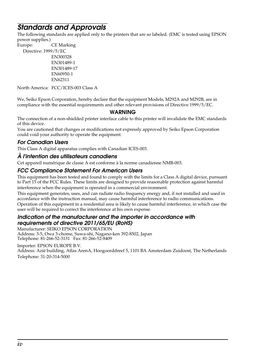 Standards and Approvals The following standards are applied only to the printers that are so labeled. (EMC is tested using EPSON power supplies.) Europe: CE Marking Directive: 1999/5/EC EN300328 EN301489-1 EN301489-17 EN60950-1 EN62311 North America: FCC/ICES-003 Class A We, Seiko Epson Corporation, hereby declare that the equipment Models, M292A and M292B, are in compliance with the essential requirements and other relevant provisions of Directive 1999/5/EC.