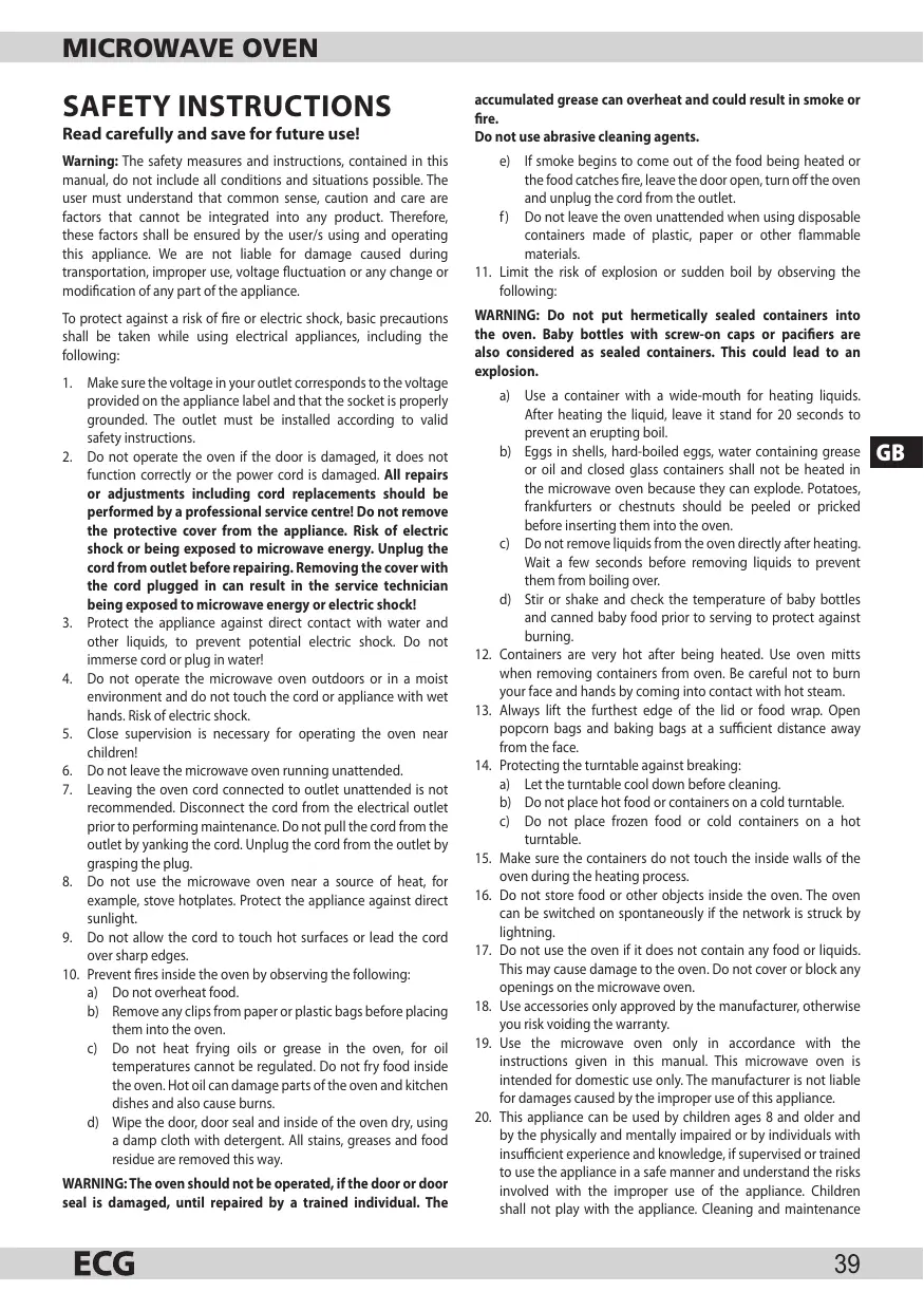 a) Use a container with a wide-mouth for heating liquids. After heating the liquid, leave it stand for 20 seconds to prevent an erupting boil. b) Eggs in shells, hard-boiled eggs, water containing grease or oil and closed glass containers shall not be heated in the microwave oven because they can explode. Potatoes, frankfurters or chestnuts should be peeled or pricked before inserting them into the oven. c) Do not remove liquids from the oven directly after heating. Wait a few seconds before removing liquids to prevent them from boiling over. d) Stir or shake and check the temperature of baby bottles and canned baby food prior to serving to protect against burning. Containers are very hot after being heated. Use oven mitts when removing containers from oven. Be careful not to burn your face and hands by coming into contact with hot steam. Always lift the furthest edge of the lid or food wrap. Open popcorn bags and baking bags at a sufficient distance away from the face. Protecting the turntable against breaking: a) Let the turntable cool down before cleaning. b) Do not place hot food or containers on a cold turntable. c) Do not place frozen food or cold containers on a hot turntable. Make sure the containers do not touch the inside walls of the oven during the heating process. Do not store food or other objects inside the oven. The oven can be switched on spontaneously if the network is struck by lightning. Do not use the oven if it does not contain any food or liquids. This may cause damage to the oven. Do not cover or block any openings on the microwave oven. Use accessories only approved by the manufacturer, otherwise you risk voiding the warranty. Use the microwave oven only in accordance with the instructions given in this manual. This microwave oven is intended for domestic use only. The manufacturer is not liable for damages caused by the improper use of this appliance. This appliance can be used by children ages 8 and older and by the physically and mentally impaired or by individuals with insufficient experience and knowledge, if supervised or trained to use the appliance in a safe manner and understand the risks involved with the improper use of the appliance. Children shall not play with the appliance. Cleaning and maintenance