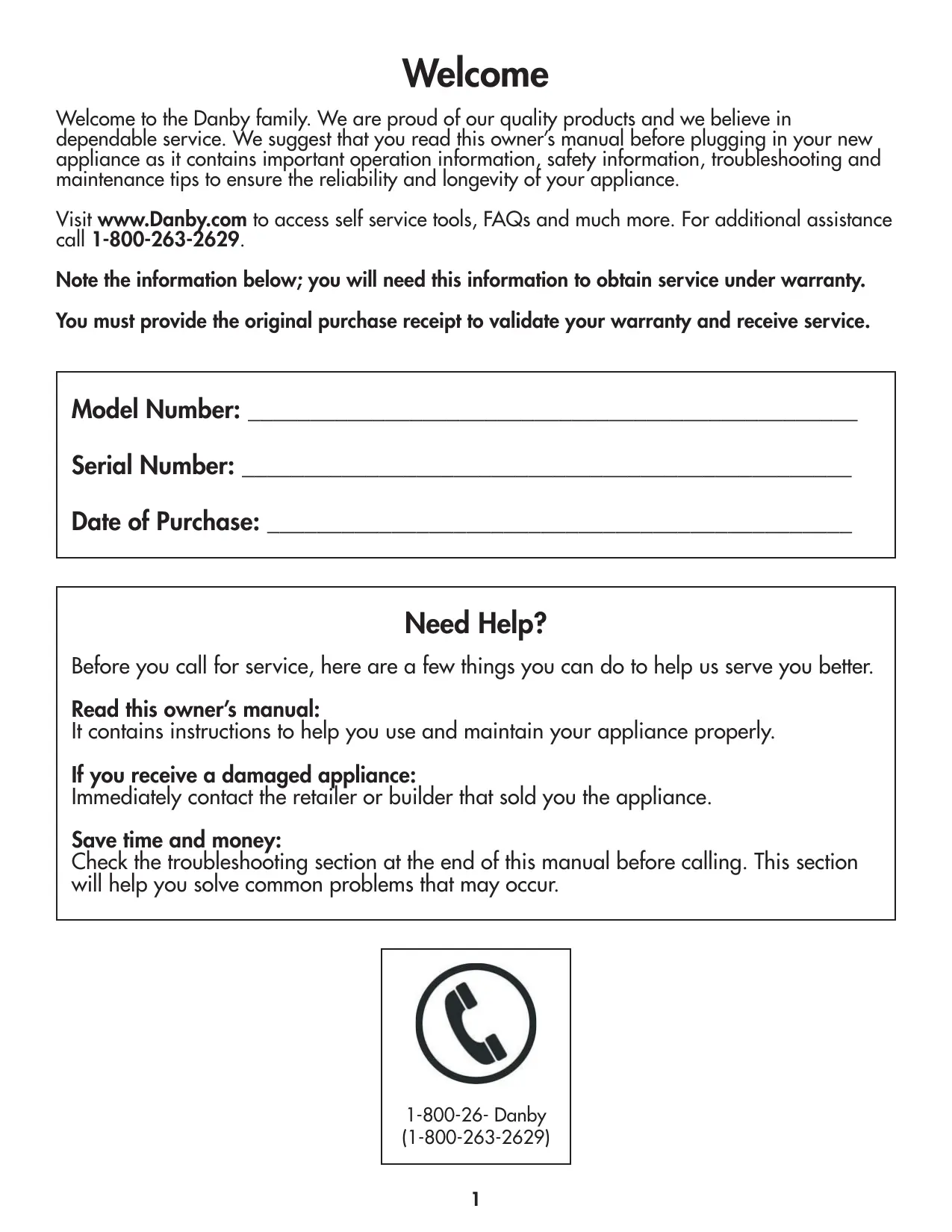 Welcome Welcome to the Danby family. We are proud of our quality products and we believe in dependable service. We suggest that you read this owner’s manual before plugging in your new appliance as it contains important operation information, safety information, troubleshooting and maintenance tips to ensure the reliability and longevity of your appliance. Visit www.Danby.com to access self service tools, FAQs and much more. For additional assistance call 1-800-263-2629. Note the information below; you will need this information to obtain service under warranty. You must provide the original purchase receipt to validate your warranty and receive service. Model Number: _________________________________________________ Serial Number: _________________________________________________ Date of Purchase: _______________________________________________ Need Help? Before you call for service, here are a few things you can do to help us serve you better. Read this owner’s manual: It contains instructions to help you use and maintain your appliance properly. If you receive a damaged appliance: Immediately contact the retailer or builder that sold you the appliance. Save time and money: Check the troubleshooting section at the end of this manual before calling. This section will help you solve common problems that may occur. 1-800-26- Danby (1-800-263-2629)