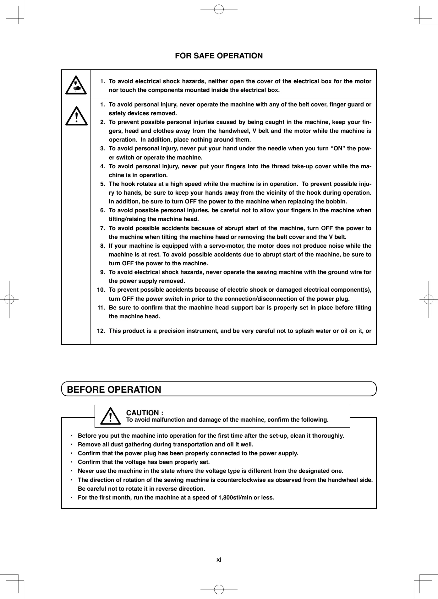 1. To avoid electrical shock hazards, neither open the cover of the electrical box for the motor nor touch the components mounted inside the electrical box. 1. To avoid personal injury, never operate the machine with any of the belt cover, finger guard or safety devices removed. 2. To prevent possible personal injuries caused by being caught in the machine, keep your fingers, head and clothes away from the handwheel, V belt and the motor while the machine is operation. In addition, place nothing around them. 3. To avoid personal injury, never put your hand under the needle when you turn “ON” the power switch or operate the machine. 4. To avoid personal injury, never put your fingers into the thread take-up cover while the machine is in operation. 5. The hook rotates at a high speed while the machine is in operation. To prevent possible injury to hands, be sure to keep your hands away from the vicinity of the hook during operation. In addition, be sure to turn OFF the power to the machine when replacing the bobbin. 6. To avoid possible personal injuries, be careful not to allow your fingers in the machine when tilting/raising the machine head. 7. To avoid possible accidents because of abrupt start of the machine, turn OFF the power to the machine when tilting the machine head or removing the belt cover and the V belt. 8. If your machine is equipped with a servo-motor, the motor does not produce noise while the machine is at rest. To avoid possible accidents due to abrupt start of the machine, be sure to turn OFF the power to the machine. 9. To avoid electrical shock hazards, never operate the sewing machine with the ground wire for the power supply removed. 10. To prevent possible accidents because of electric shock or damaged electrical component(s), turn OFF the power switch in prior to the connection/disconnection of the power plug. 11. Be sure to confirm that the machine head support bar is properly set in place before tilting the machine head. 12. This product is a precision instrument, and be very careful not to splash water or oil on it, or