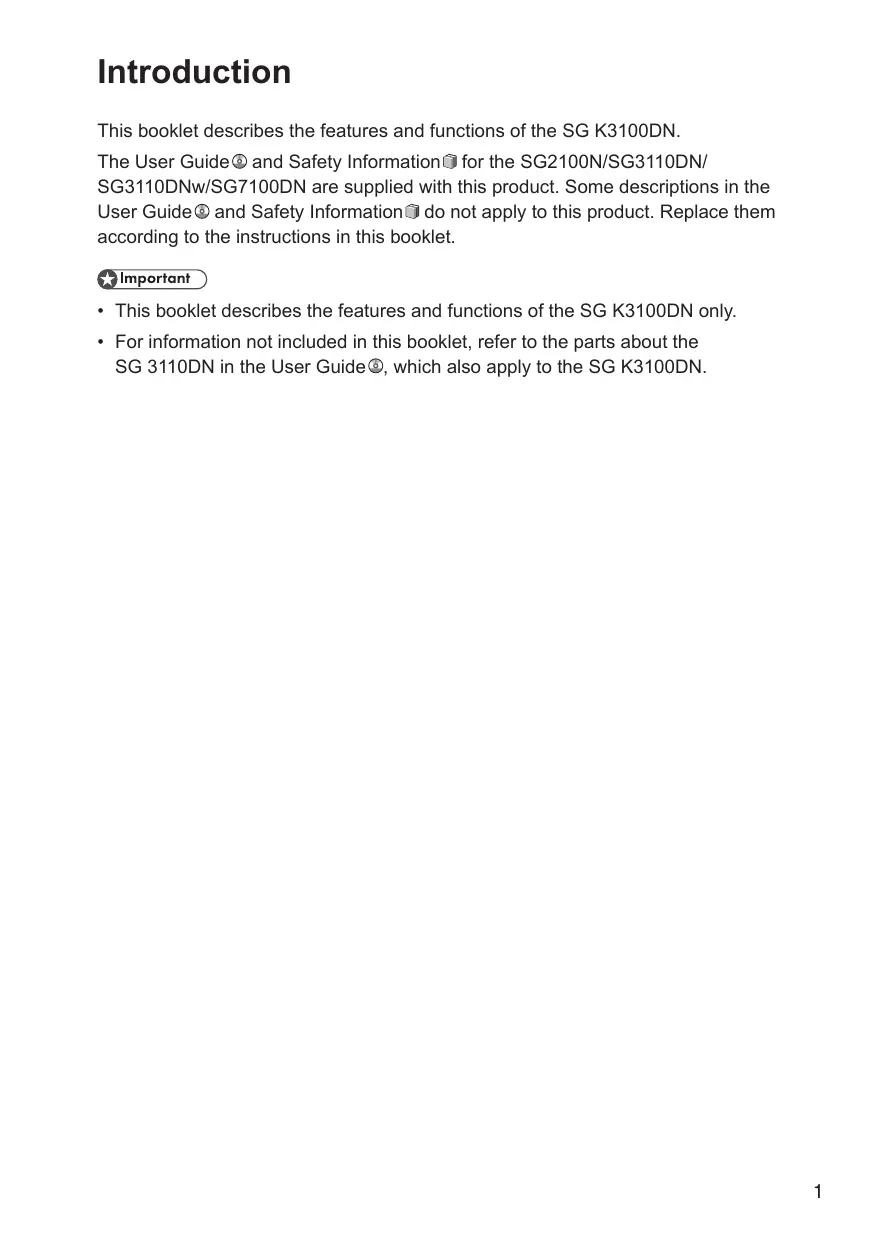 Introduction This booklet describes the features and functions of the SG K3100DN. The User Guide and Safety Information for the SG2100N/SG3110DN/ SG3110DNw/SG7100DN are supplied with this product. Some descriptions in the User Guide and Safety Information do not apply to this product. Replace them according to the instructions in this booklet.