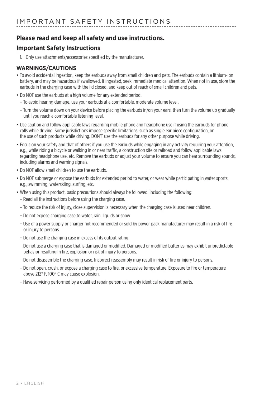 - Do NOT submerge or expose the earbuds for extended period to water, or wear while participating in water sports, e.g., swimming, waterskiing, surfing, etc.
