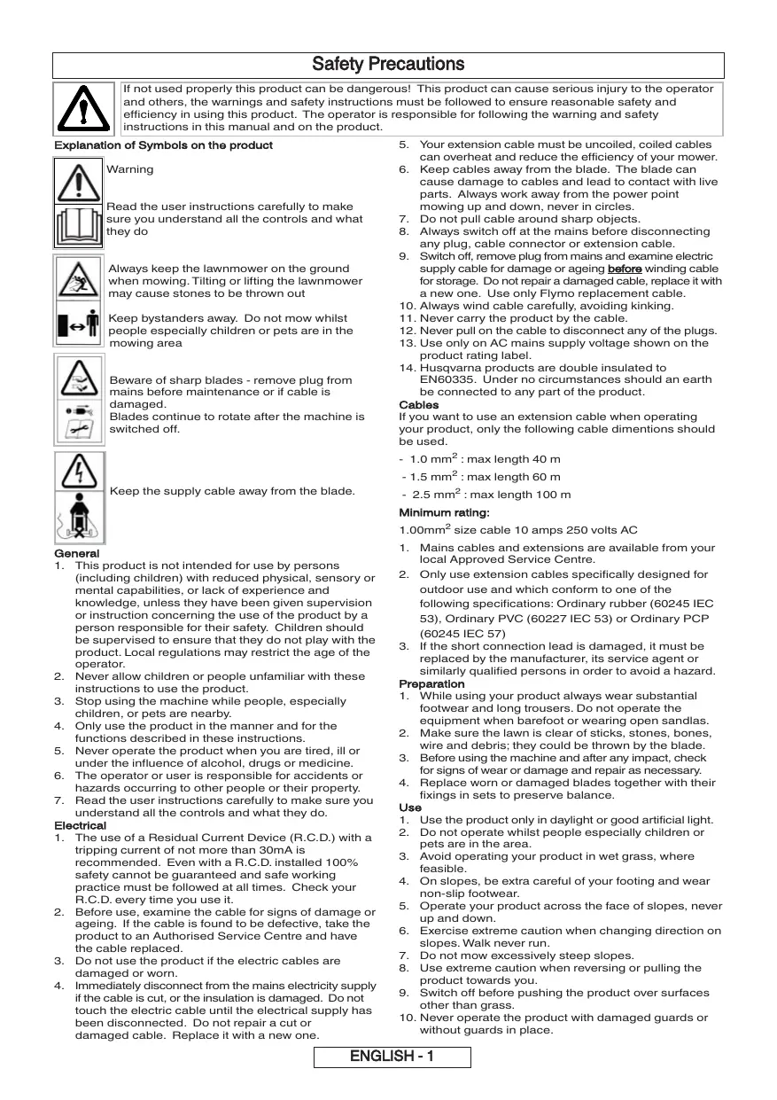 - If necessary, contact your local authority for disposal information. The symbol on the product or on its packaging indicates that this product may not be treated as household waste. Instead it shall be handed over to the applicable collection point for the recycling of electrical and electronic equipment. By ensuring this product is disposed of correctly, you will help prevent potential negative consequences for the environment and human health, which could otherwise be caused by inappropriate waste handling of this product. For more detailed information about recycling of this product, please contact your local council office, your household waste disposal service or the shop where you purchased the product. Guarantee and Guarantee Policy If any part is found to be defective due to faulty manufacture within the guarantee period, Husqvarna Ltd., through its Authorised Service Repairers will effect the repair or replacement to the customer free of charge providing: (a) The fault is reported directly to the Authorised Repairer. (b) Proof of purchase is provided. (c) The fault is not caused by misuse, neglect or faulty adjustment by the user. (d) The failure has not occurred through fair wear and tear. (e) The machine has not been serviced or repaired, taken apart or tampered with by any person not authorised by Husqvarna Ltd.. (f) The machine has not been used for hire. (g) The machine is owned by the original purchaser. (h) The machine has not been used commercially. This guarantee is additional to, and in no way diminishes the customers statutory rights. Failures due to the following are not covered, therefore it is important that you read the instructions contained in this Operator's Manual and understand how to operate and maintain your machine: Failures not covered by guarantee Failures as a result of not reporting an initial fault. Failures as a result of sudden impact. Failures as a result of not using the product in accordance with the instructions and recommendations contained in this Operator's Manual. Machines used for hire are not covered by this guarantee. The following items listed are considered as wearing parts and their life is dependent on regular maintenance and are, therefore not normally subject to a valid warranty claim: Blades, Electric Mains cable Caution! Husqvarna Ltd. does not accept liability under the warranty for defects caused in whole or part, directly or indirectly by the fitting of replacement parts or additional parts that are not either manufactured or approved by Husqvarna Ltd., or by the machine having been modified in any way. ENGLISH - 2