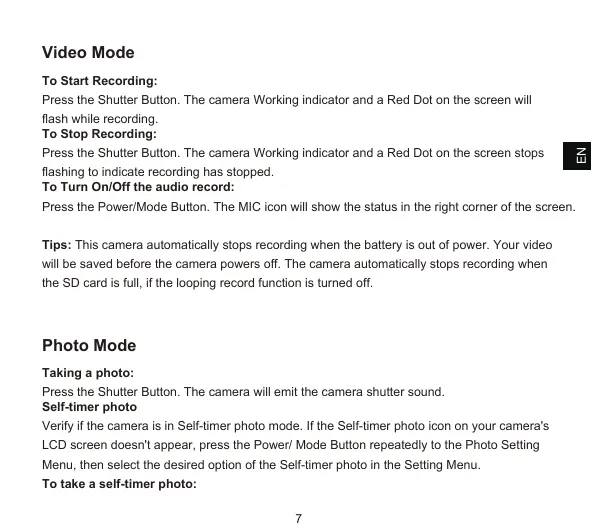 Tips: This camera automatically stops recording when the battery is out of power. Your video will be saved before the camera powers off. The camera automatically stops recording when the SD card is full, if the looping record function is turned off.