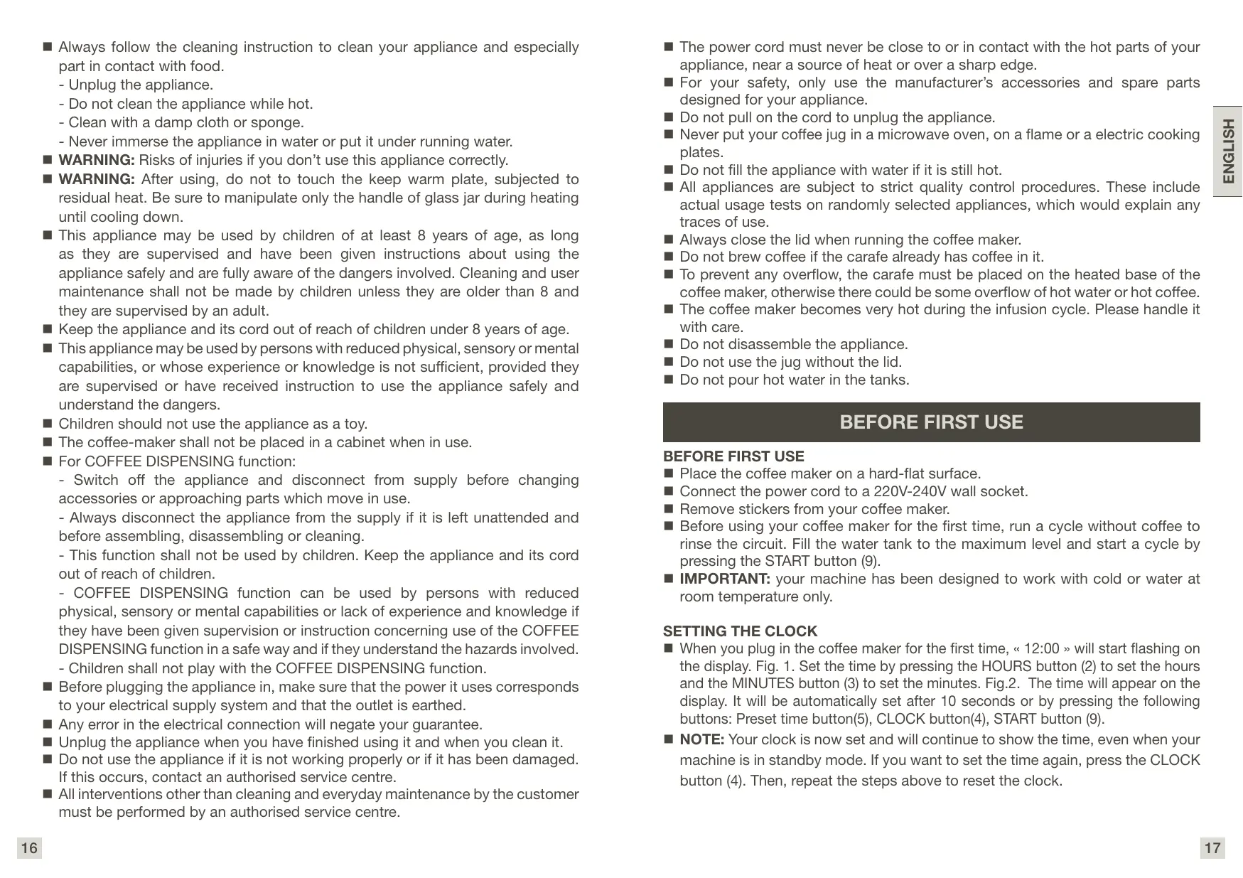 - Unplug the appliance. - Do not clean the appliance while hot. - Clean with a damp cloth or sponge. - Never immerse the appliance in water or put it under running water. WARNING: Risks of injuries if you don’t use this appliance correctly. WARNING: After using, do not to touch the keep warm plate, subjected to residual heat. Be sure to manipulate only the handle of glass jar during heating until cooling down. This appliance may be used by children of at least 8 years of age, as long as they are supervised and have been given instructions about using the appliance safely and are fully aware of the dangers involved. Cleaning and user maintenance shall not be made by children unless they are older than 8 and they are supervised by an adult. Keep the appliance and its cord out of reach of children under 8 years of age. This appliance may be used by persons with reduced physical, sensory or mental capabilities, or whose experience or knowledge is not sufficient, provided they are supervised or have received instruction to use the appliance safely and understand the dangers. Children should not use the appliance as a toy. The coffee-maker shall not be placed in a cabinet when in use. For COFFEE DISPENSING function: - Switch off the appliance and disconnect from supply before changing accessories or approaching parts which move in use. - Always disconnect the appliance from the supply if it is left unattended and before assembling, disassembling or cleaning. - This function shall not be used by children. Keep the appliance and its cord out of reach of children. - COFFEE DISPENSING function can be used by persons with reduced physical, sensory or mental capabilities or lack of experience and knowledge if they have been given supervision or instruction concerning use of the COFFEE DISPENSING function in a safe way and if they understand the hazards involved. - Children shall not play with the COFFEE DISPENSING function. Before plugging the appliance in, make sure that the power it uses corresponds to your electrical supply system and that the outlet is earthed. Any error in the electrical connection will negate your guarantee. Unplug the appliance when you have finished using it and when you clean it. Do not use the appliance if it is not working properly or if it has been damaged. If this occurs, contact an authorised service centre. All interventions other than cleaning and everyday maintenance by the customer must be performed by an authorised service centre.