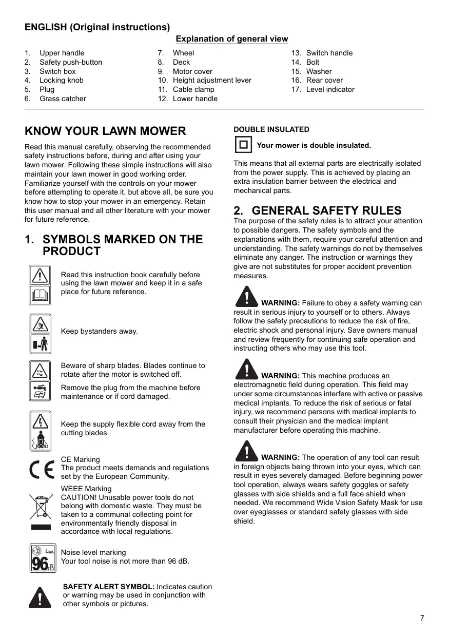 KEEP FOR FUTURE REFERENCE. 1. Read the instructions carefully. Be familiar with the controls and the proper use of the equipment. 2. Never allow children or people unfamiliar with these instructions to use the lawn mower. Local regulations can restrict the age of the operator. 3. Never mow while people, especially children, or pets are nearby. 4. Keep in mind that the operator or user is responsible for accidents or hazards occurring to other people or their property. 5. While mowing, always wear substantial footwear and long trousers. Do not operate the equipment when barefoot or wearing open sandals; Avoid wearing clothing that is loose fitting or that has hanging cords or ties. 6. Thoroughly inspect the area where the equipment is to be used and remove all objects which can be thrown by the machine. 7. Before using, always visually inspect to see that the blades, blade bolts and cutter assembly are not worn or damaged. Replace worn or damaged blades and bolts in sets to preserve balance. Replace damaged or unreadable labels. 8. Before use check the supply and extension cord for signs of damage or worn. If the cord becomes damaged during use, disconnect the cord from the supply immediately. DO NOT TOUCH THE CORD BEFORE DISCONNECTING THE SUPPLY. Do not use the appliance if the cord is damaged or worn. 9. Mow only in daylight or in good artificial light. 10. Avoid operating the equipment in wet grass, where feasible. 11. Always be sure of your footing on slopes. 12. Walk, never run. 13. For wheeled rotary machines; mow across the face of slopes, never up and down. 14. Exercise extreme caution when changing direction on slopes. 15. Do not mow excessively steep slopes. 16. Use extreme caution when reversing or pulling the lawn mower towards you. 17. Stop the blades if the lawn mower has to be tilted for transportation when crossing surfaces other than grass, and when transporting the lawn mower to and from the area to be mowed. 18. Never operate the lawn mower with defective guards, or without safety devices, for example deflectors and/ or grass catchers, in place. 19. Start or switch on the motor carefully according to instructions and with feet well away from the blades. 20. Do not tilt the lawn mower when starting switching on the motor, except if the lawn mower has to be tilted for starting. In this case, do not tile it more than absolutely necessary and lift only the part which is away from the operator. 21. Do not start the motor when standing in front of the discharge chute. 8
