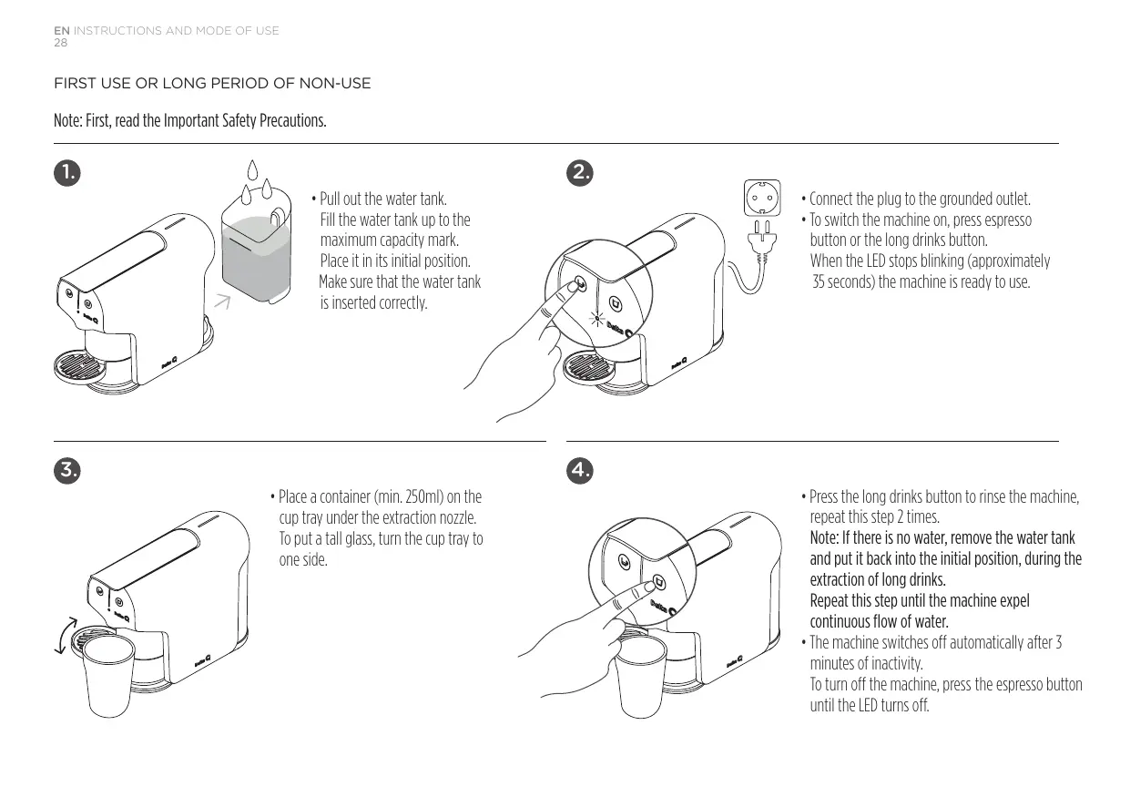 Note: If there is no water, remove the water tank and put it back into the initial position, during the extraction of long drinks. Repeat this step until the machine expel continuous flow of water. • The machine switches off automatically after 3 minutes of inactivity. To turn off the machine, press the espresso button until the LED turns off.