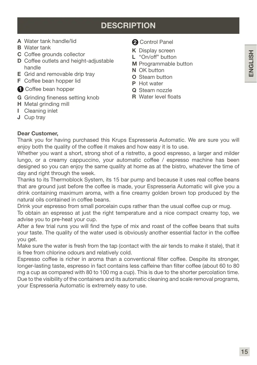 Thank you for having purchased this Krups Espresseria Automatic. We are sure you will enjoy both the quality of the coffee it makes and how easy it is to use. Whether you want a short, strong shot of a ristretto, a good espresso, a larger and milder lungo, or a creamy cappuccino, your automatic coffee / espresso machine has been designed so you can enjoy the same quality at home as at the bistro, whatever the time of day and right through the week. Thanks to its Thermoblock System, its 15 bar pump and because it uses real coffee beans that are ground just before the coffee is made, your Espresseria Automatic will give you a drink containing maximum aroma, with a fine creamy golden brown top produced by the natural oils contained in coffee beans. Drink your espresso from small porcelain cups rather than the usual coffee cup or mug. To obtain an espresso at just the right temperature and a nice compact creamy top, we advise you to pre-heat your cup. After a few trial runs you will find the type of mix and roast of the coffee beans that suits your taste. The quality of the water used is obviously another essential factor in the coffee you get. Make sure the water is fresh from the tap (contact with the air tends to make it stale), that it is free from chlorine odours and relatively cold. Espresso coffee is richer in aroma than a conventional filter coffee. Despite its stronger, longer-lasting taste, espresso in fact contains less caffeine than filter coffee (about 60 to 80 mg a cup as compared with 80 to 100 mg a cup). This is due to the shorter percolation time. Due to the visibility of the containers and its automatic cleaning and scale removal programs, your Espresseria Automatic is extremely easy to use.