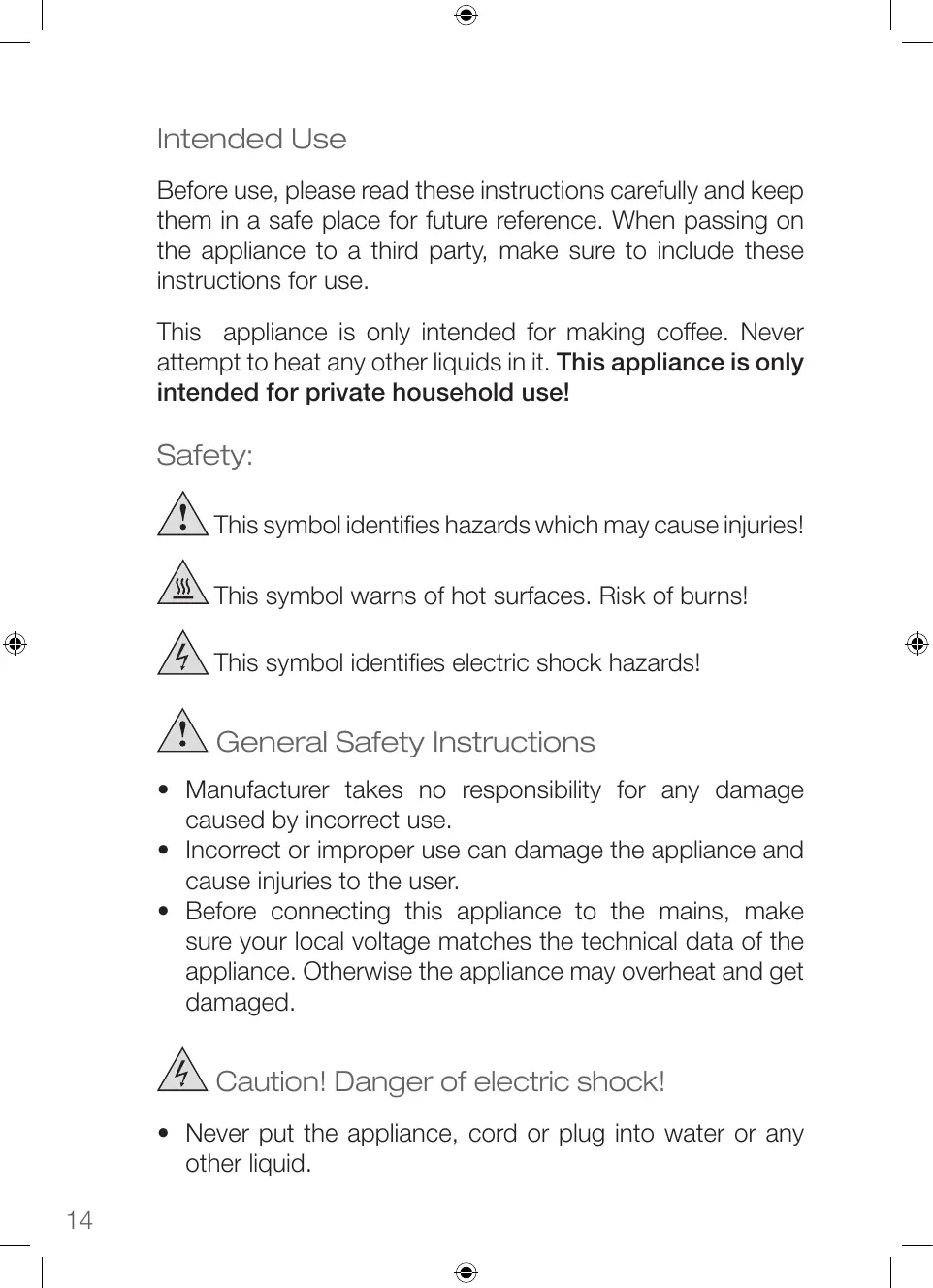 Intended Use Before use, please read these instructions carefully and keep them in a safe place for future reference. When passing on the appliance to a third party, make sure to include these instructions for use. This appliance is only intended for making coffee. Never attempt to heat any other liquids in it. This appliance is only intended for private household use! Safety: This symbol identifies hazards which may cause injuries! This symbol warns of hot surfaces. Risk of burns! This symbol identifies electric shock hazards! General Safety Instructions