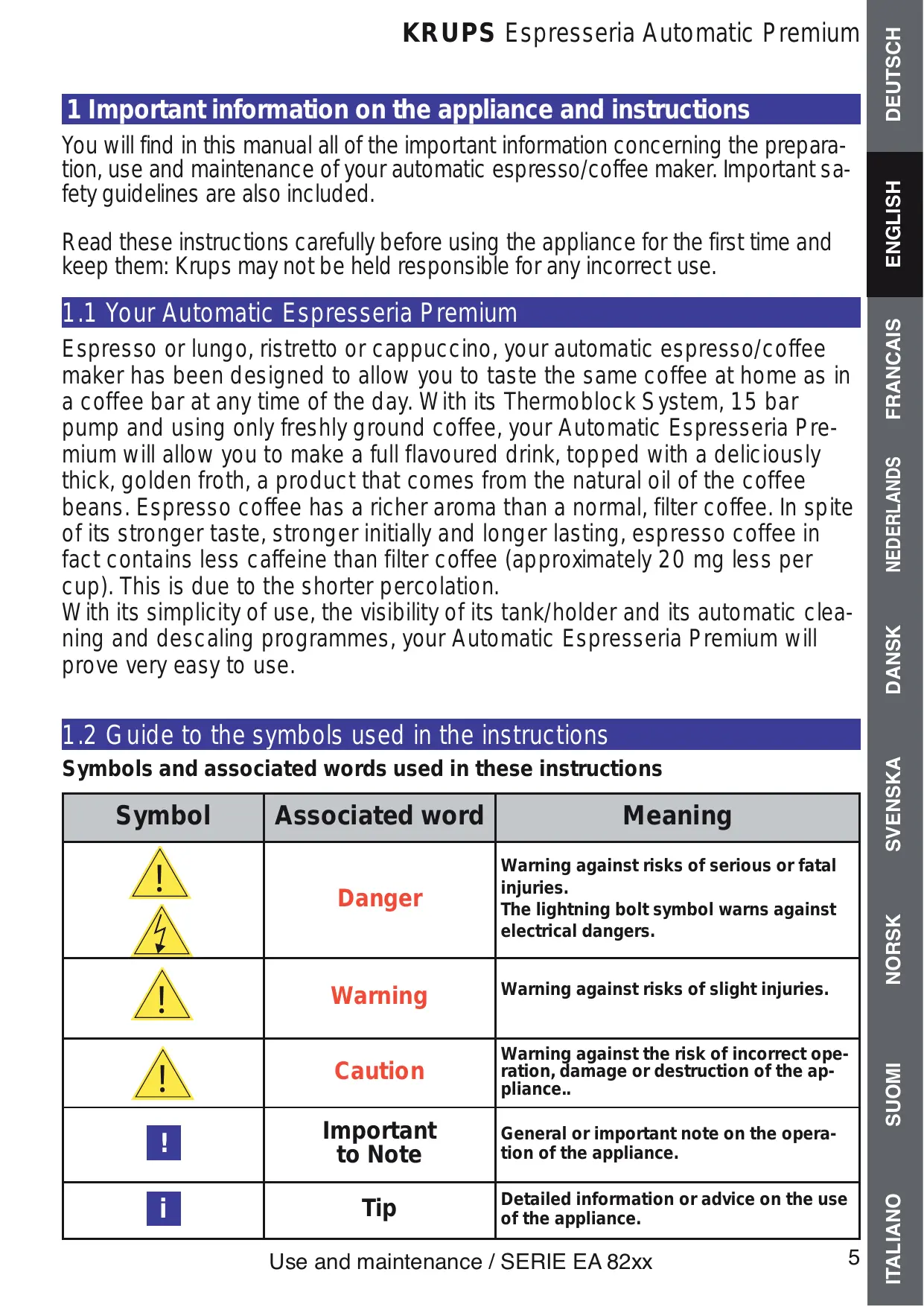 Download the instructions for your Machine à café in PDF format for free! Find your manual BEAN TO CUP EA8258 - KRUPS and take your electronic device back in hand. On this page are published all the documents necessary for the use of your device. BEAN TO CUP EA8258 by KRUPS.