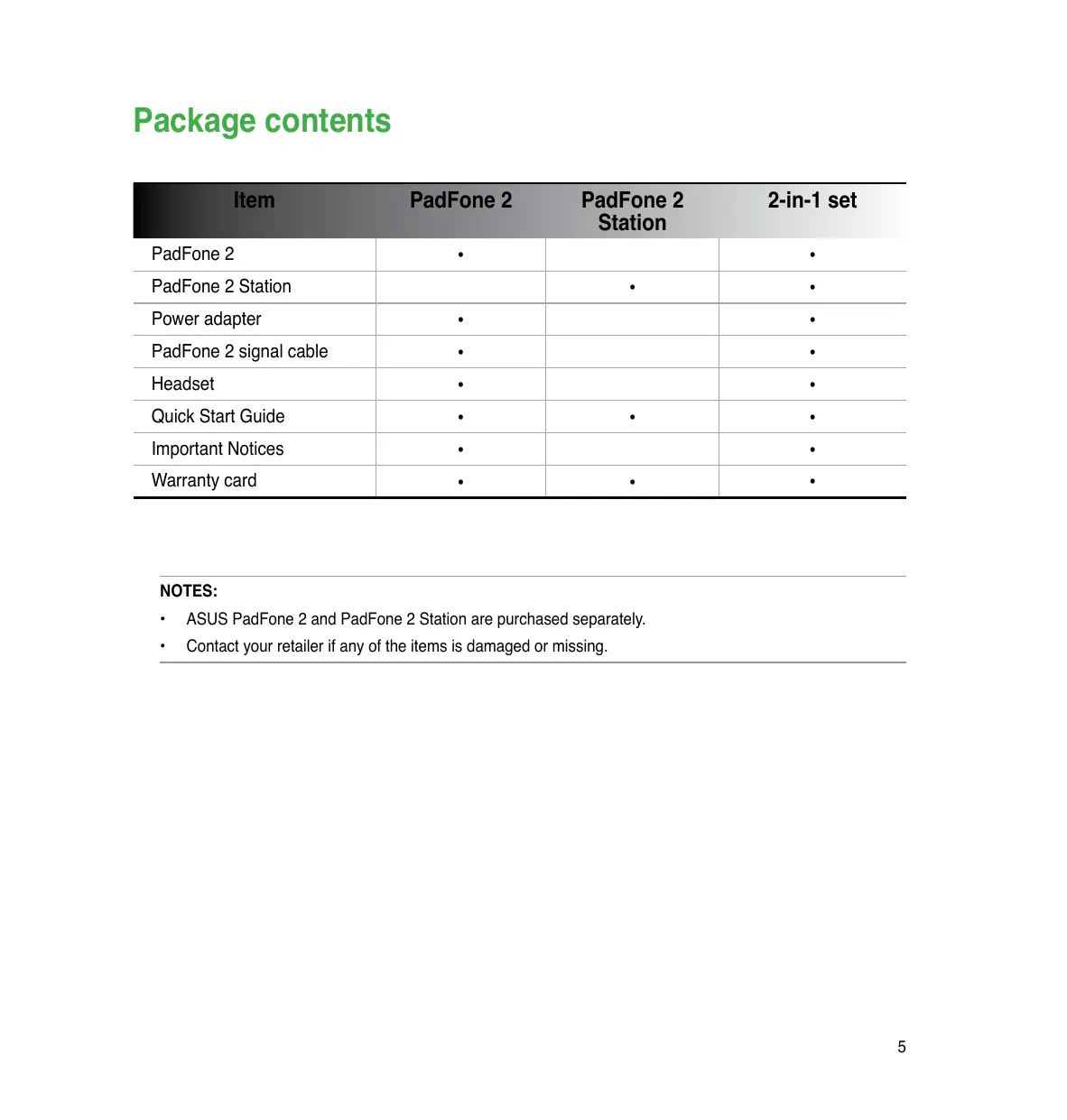 | Item | PadFone 2 | PadFone 2 Station | 2-in-1 set |