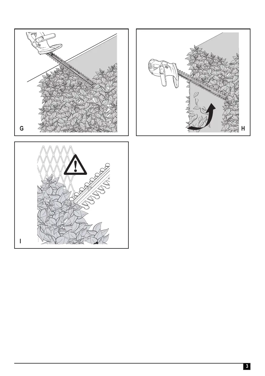 (up to 15° relative to the line of cut) so that the blade tips point slightly towards the hedge (fig. F). This will cause the blades to cut more effectively. Hold the tool at the desired angle and move it steadily along the line of cut. The double-sided blade allows you to cut in either direction. In order to obtain a very straight cut, stretch a piece of string along the length of the hedge at the desired height. Use the string as a guideline, cutting just above it (fig. G). In order to obtain flat sides, cut upwards with the growth. Younger stems move outwards when the blade cuts downwards, causing shallow patches in the hedge (fig. H). Take care to avoid any foreign objects. Especially avoid hard objects such as metal wire and railings, as these could damage the blades (fig. I). Regularly oil the blades.