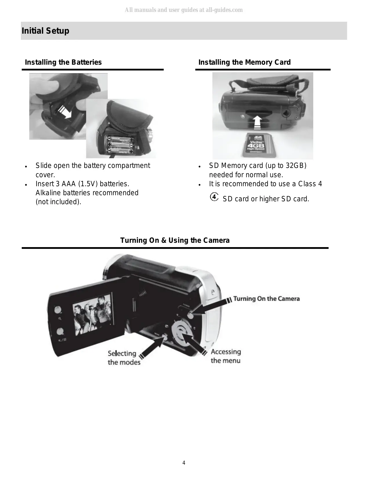 SD Memory card (up to 32GB) needed for normal use. It is recommended to use a Class 4 SD card or higher SD card. Turning On & Using the Camera