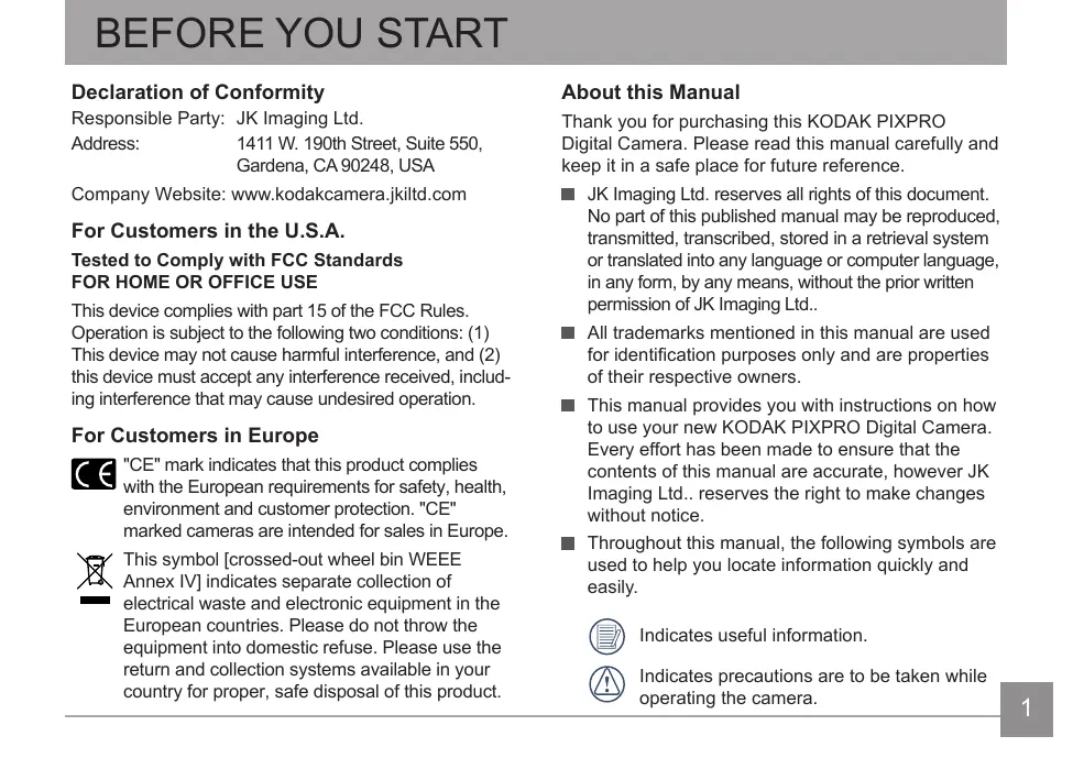 About this Manual Thank you for purchasing this KODAK PIXPRO Digital Camera. Please read this manual carefully and keep it in a safe place for future reference. JK Imaging Ltd. reserves all rights of this document. No part of this published manual may be reproduced, transmitted, transcribed, stored in a retrieval system or translated into any language or computer language, in any form, by any means, without the prior written permission of JK Imaging Ltd.. All trademarks mentioned in this manual are used for identification purposes only and are properties of their respective owners. This manual provides you with instructions on how to use your new KODAK PIXPRO Digital Camera. Every effort has been made to ensure that the contents of this manual are accurate, however JK Imaging Ltd.. reserves the right to make changes without notice. Throughout this manual, the following symbols are used to help you locate information quickly and easily. Indicates useful information. Indicates precautions are to be taken while operating the camera.