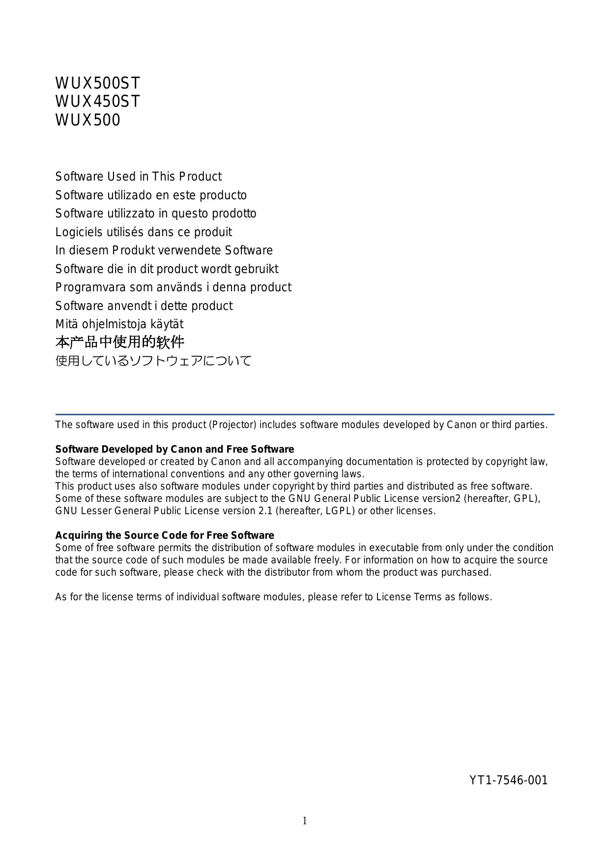 使用しているソフトウェアについて The software used in this product (Projector) includes software modules developed by Canon or third parties. Software Developed by Canon and Free Software Software developed or created by Canon and all accompanying documentation is protected by copyright law, the terms of international conventions and any other governing laws. This product uses also software modules under copyright by third parties and distributed as free software. Some of these software modules are subject to the GNU General Public License version2 (hereafter, GPL), GNU Lesser General Public License version 2.1 (hereafter, LGPL) or other licenses. Acquiring the Source Code for Free Software Some of free software permits the distribution of software modules in executable from only under the condition that the source code of such modules be made available freely. For information on how to acquire the source code for such software, please check with the distributor from whom the product was purchased. As for the license terms of individual software modules, please refer to License Terms as follows. YT1-7546-001
