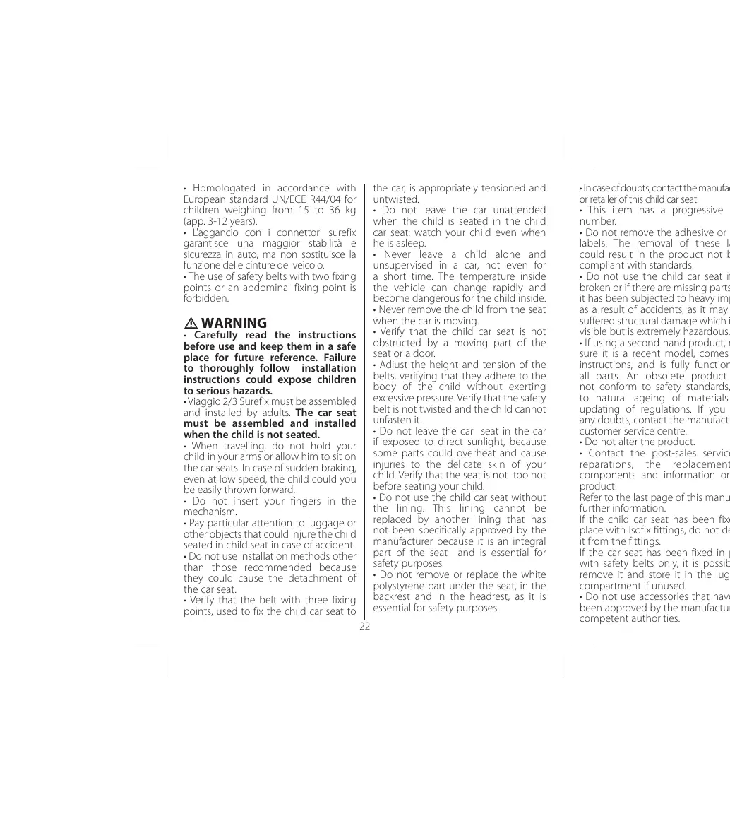 • Viaggio 2/3 Surefix must be assembled and installed by adults. The car seat must be assembled and installed when the child is not seated. • When travelling, do not hold your child in your arms or allow him to sit on the car seats. In case of sudden braking, even at low speed, the child could you be easily thrown forward. • Do not insert your fingers in the mechanism. • Pay particular attention to luggage or other objects that could injure the child seated in child seat in case of accident. • Do not use installation methods other than those recommended because they could cause the detachment of the car seat. • Verify that the belt with three fixing points, used to fix the child car seat to 22