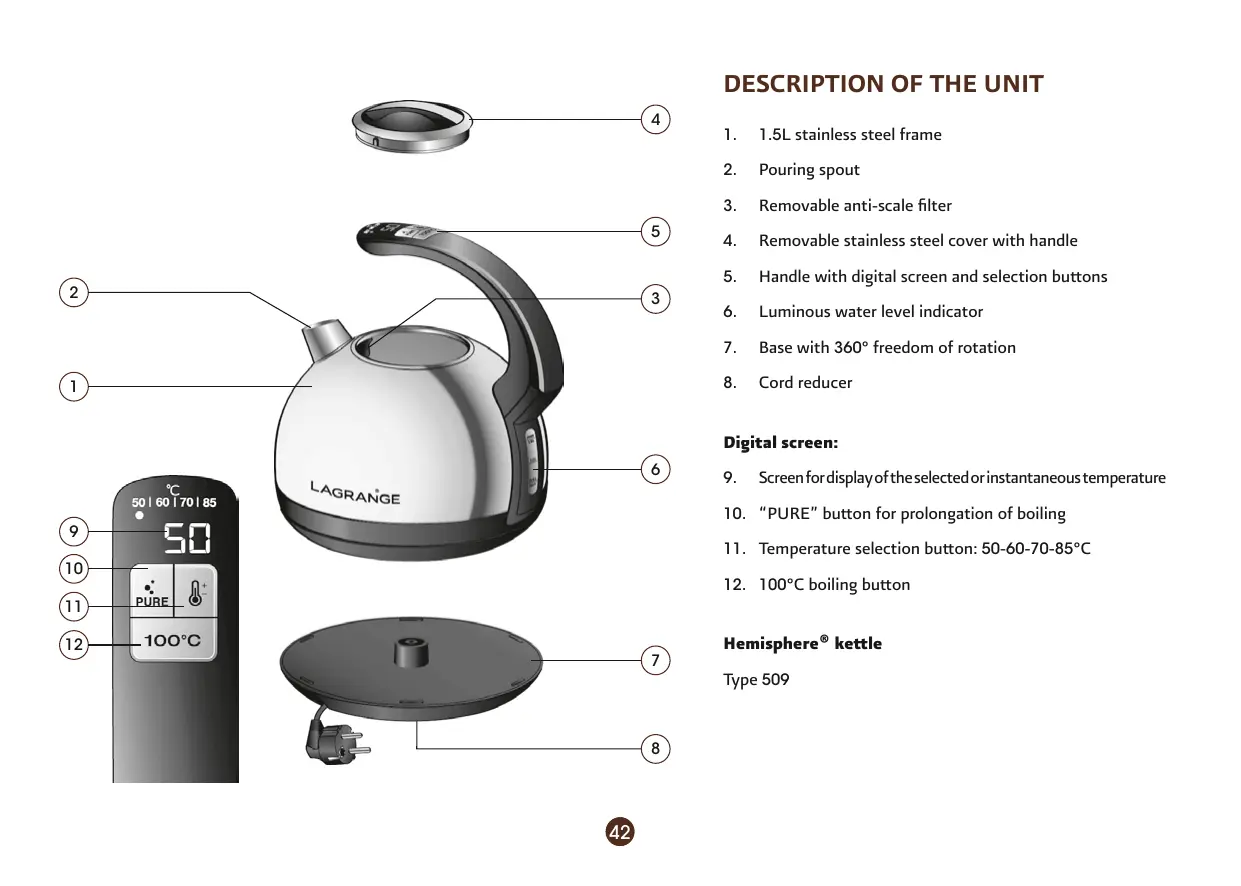 **Capacité 1,5 L **Ecran électronique avec rétroéclairage **Bouton de sélection de la température : 50 - 60 - 70 - 85 °C **Bouton d’ébullition 100 °C **Bouton « PURE » de prolongation de l’ébullition **Niveau d’eau lumineux, lumière colorée plus ou moins chaude selon la température de l’eau (en mode 100 °C) **Système de maintien au chaud **Filtre anticalcaire **Base de 360 ° sans fil **Dispositif anti-ébullition à sec **Puissance : 2400 watts