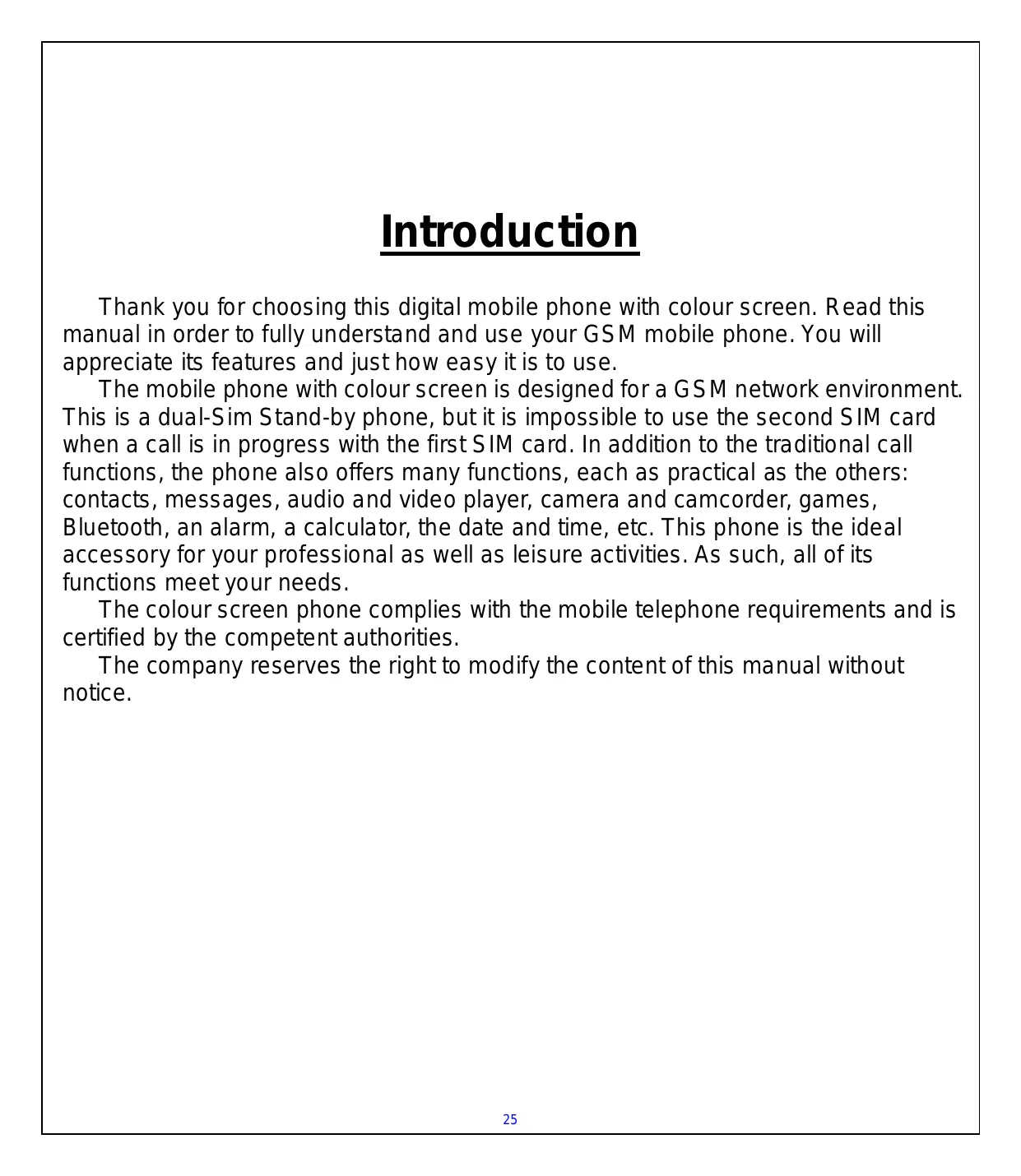 Introduction Thank you for choosing this digital mobile phone with colour screen. Read this manual in order to fully understand and use your GSM mobile phone. You will appreciate its features and just how easy it is to use. The mobile phone with colour screen is designed for a GSM network environment. This is a dual-Sim Stand-by phone, but it is impossible to use the second SIM card when a call is in progress with the first SIM card. In addition to the traditional call functions, the phone also offers many functions, each as practical as the others: contacts, messages, audio and video player, camera and camcorder, games, Bluetooth, an alarm, a calculator, the date and time, etc. This phone is the ideal accessory for your professional as well as leisure activities. As such, all of its functions meet your needs. The colour screen phone complies with the mobile telephone requirements and is certified by the competent authorities. The company reserves the right to modify the content of this manual without notice.