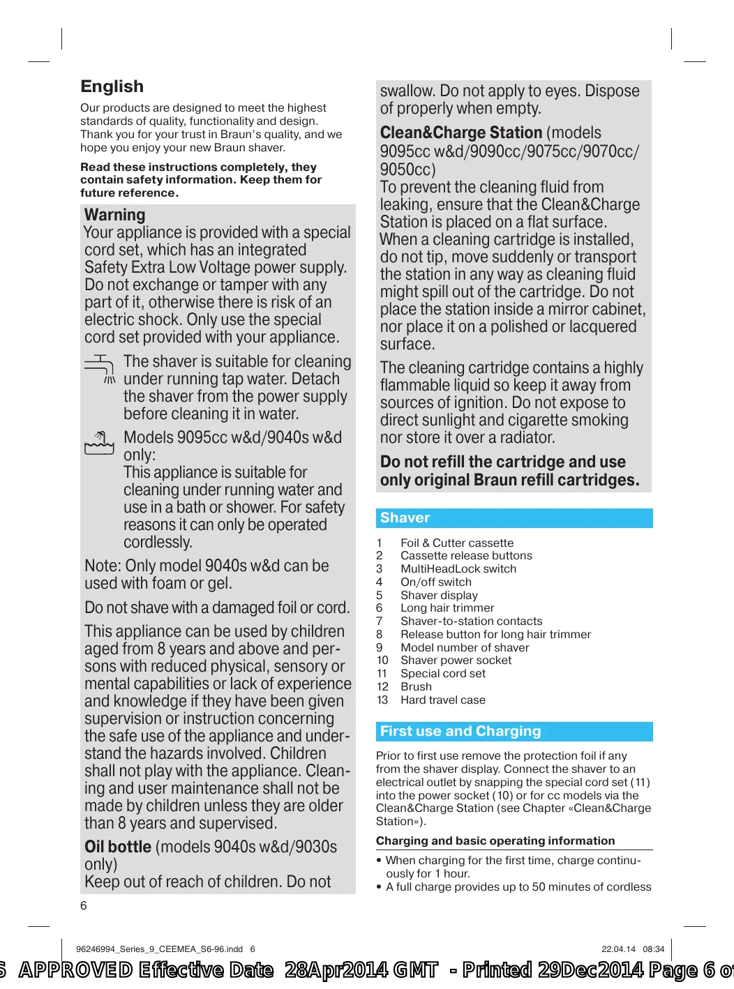 swallow. Do not apply to eyes. Dispose of properly when empty. Clean&Charge Station (models 9095cc w&d/9090cc/9075cc/9070cc/ 9050cc) To prevent the cleaning fluid from leaking, ensure that the Clean&Charge Station is placed on a flat surface. When a cleaning cartridge is installed, do not tip, move suddenly or transport the station in any way as cleaning fluid might spill out of the cartridge. Do not place the station inside a mirror cabinet, nor place it on a polished or lacquered surface. The cleaning cartridge contains a highly flammable liquid so keep it away from sources of ignition. Do not expose to direct sunlight and cigarette smoking nor store it over a radiator. Do not refill the cartridge and use only original Braun refill cartridges. Shaver 1 2 3 4 5 6 7 8 9 10 11 12 13