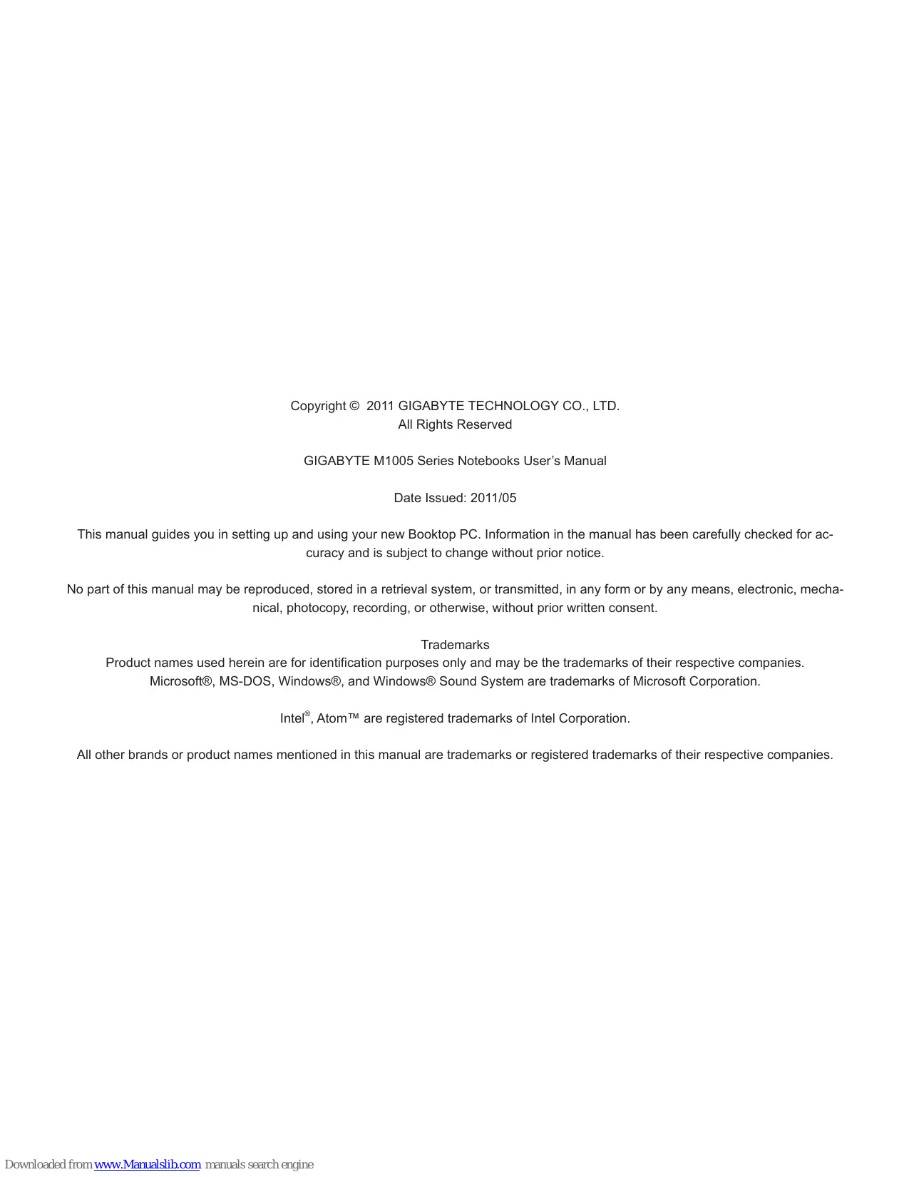 Copyright © 2011 GIGABYTE TECHNOLOGY CO., LTD. All Rights Reserved GIGABYTE M1005 Series Notebooks User’s Manual Date Issued: 2011/05 This manual guides you in setting up and using your new Booktop PC. Information in the manual has been carefully checked for accuracy and is subject to change without prior notice. No part of this manual may be reproduced, stored in a retrieval system, or transmitted, in any form or by any means, electronic, mechanical, photocopy, recording, or otherwise, without prior written consent. Trademarks Product names used herein are for identification purposes only and may be the trademarks of their respective companies. Microsoft®, MS-DOS, Windows®, and Windows® Sound System are trademarks of Microsoft Corporation. Intel®, Atom™ are registered trademarks of Intel Corporation. All other brands or product names mentioned in this manual are trademarks or registered trademarks of their respective companies.