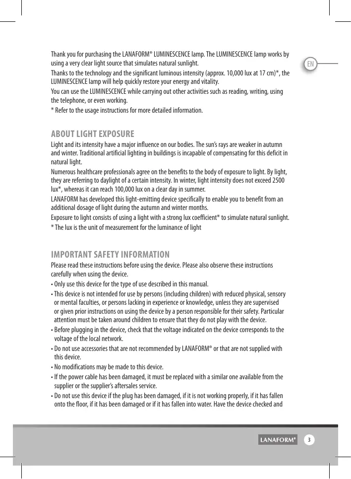Thank you for purchasing the LANAFORM® LUMINESCENCE lamp. The LUMINESCENCE lamp works by using a very clear light source that simulates natural sunlight. Thanks to the technology and the significant luminous intensity (approx. 10,000 lux at 17 cm)*, the LUMINESCENCE lamp will help quickly restore your energy and vitality. You can use the LUMINESCENCE while carrying out other activities such as reading, writing, using the telephone, or even working. * Refer to the usage instructions for more detailed information.