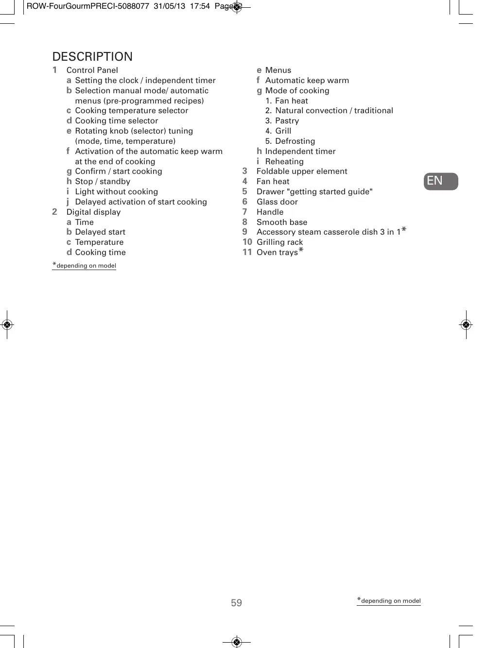 e Menus f Automatic keep warm g Mode of cooking 1. Fan heat 2. Natural convection / traditional 3. Pastry 4. Grill 5. Defrosting h Independent timer i Reheating Foldable upper element Fan heat Drawer "getting started guide" Glass door Handie Smooth base Accessory steam casserole dish 3 in 1*