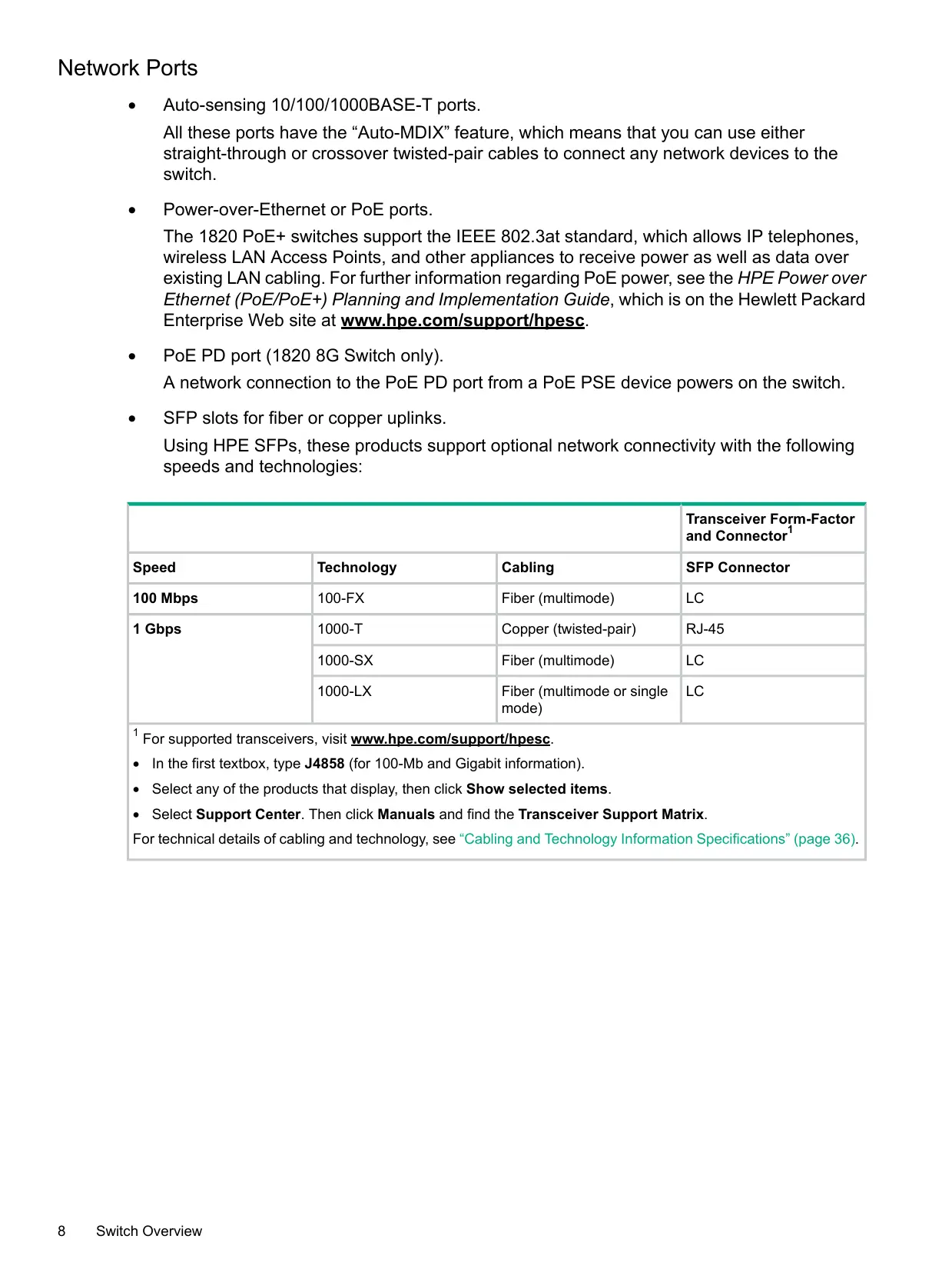 SFP slots for fiber or copper uplinks. Using HPE SFPs, these products support optional network connectivity with the following speeds and technologies: Transceiver Form-Factor 1 and Connector