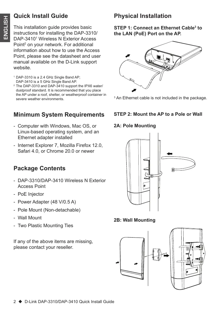 An Ethernet cable is not included in the package. Minimum System Requirements STEP 2: Mount the AP to a Pole or Wall -- Computer with Windows, Mac OS, or Linux-based operating system, and an Ethernet adapter installed 2A: Pole Mounting Package Contents -- DAP-3310/DAP-3410 Wireless N Exterior Access Point -- PoE Injector -- Power Adapter (48 V/0.5 A) -- Pole Mount (Non-detachable) -- Wall Mount -- Two Plastic Mounting Ties 2B: Wall Mounting If any of the above items are missing, please contact your reseller. A grounding wire is recommended to protect your device from lightning strikes and the buildup of static electricity. If you are configuring the AP locally, connect a PC to the PoE Injector DATA IN port using an Ethernet cable.