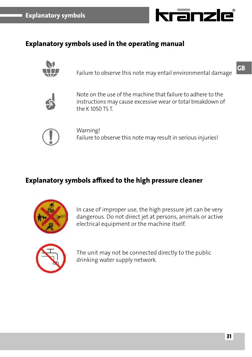 Explanatory symbols Explanatory symbols used in the operating manual Failure to observe this note may entail environmental damage Note on the use of the machine that failure to adhere to the instructions may cause excessive wear or total breakdown of the K 1050 TS T. Warning! Failure to observe this note may result in serious injuries! Explanatory symbols affixed to the high pressure cleaner In case of improper use, the high pressure jet can be very dangerous. Do not direct jet at persons, animals or active electrical equipment or the machine itself. The unit may not be connected directly to the public drinking water supply network.
