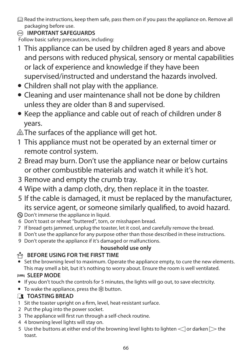 • Children shall not play with the appliance. • Cleaning and user maintenance shall not be done by children unless they are older than 8 and supervised. • Keep the appliance and cable out of reach of children under 8 years. h The surfaces of the appliance will get hot. 1 This appliance must not be operated by an external timer or remote control system. 2 Bread may burn. Don’t use the appliance near or below curtains or other combustible materials and watch it while it’s hot. 3 Remove and empty the crumb tray. 4 Wipe with a damp cloth, dry, then replace it in the toaster. 5 If the cable is damaged, it must be replaced by the manufacturer, its service agent, or someone similarly qualified, to avoid hazard. L Don’t immerse the appliance in liquid. 6 Don’t toast or reheat “buttered”, torn, or misshapen bread. 7 If bread gets jammed, unplug the toaster, let it cool, and carefully remove the bread. 8 Don’t use the appliance for any purpose other than those described in these instructions. 9 Don’t operate the appliance if it’s damaged or malfunctions.