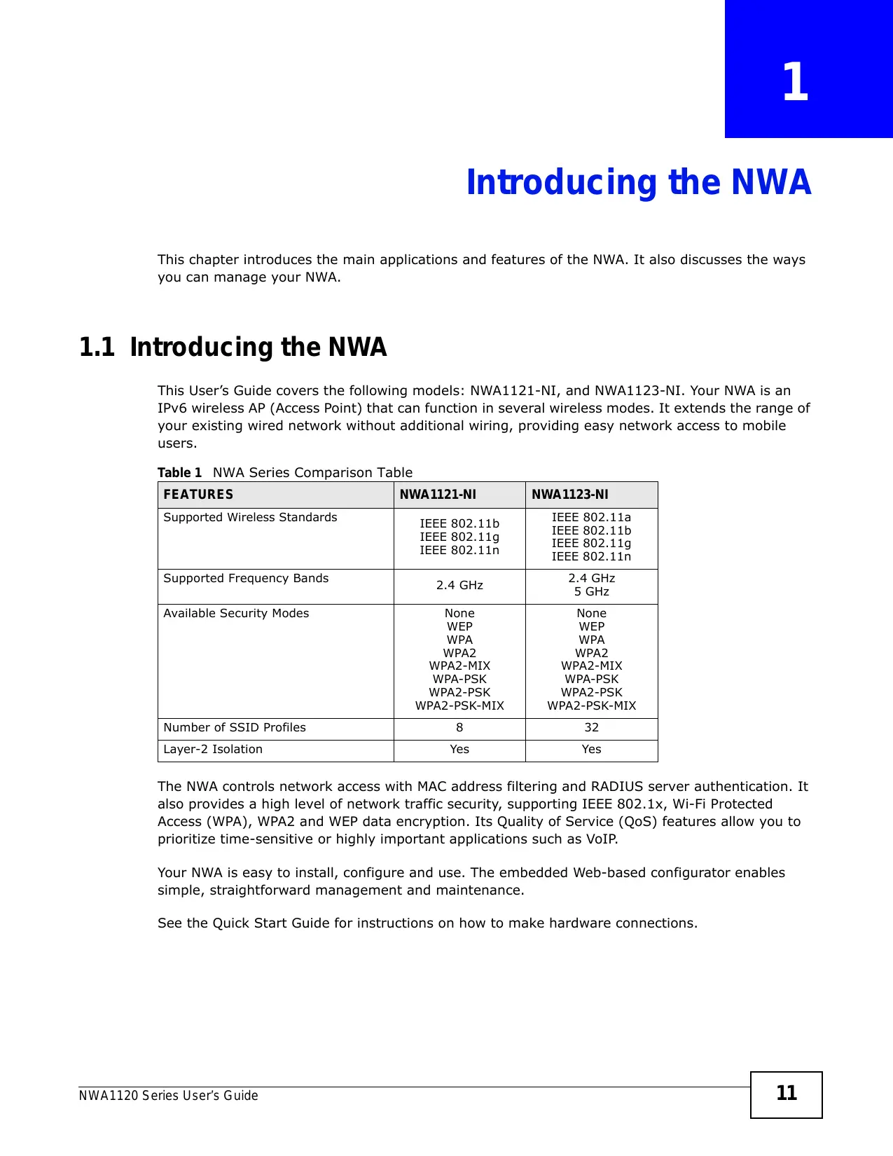 1.1 Introducing the NWA This User’s Guide covers the following models: NWA1121-NI, and NWA1123-NI. Your NWA is an IPv6 wireless AP (Access Point) that can function in several wireless modes. It extends the range of your existing wired network without additional wiring, providing easy network access to mobile users. Table 1 NWA Series Comparison Table FEATURES Supported Wireless Standards