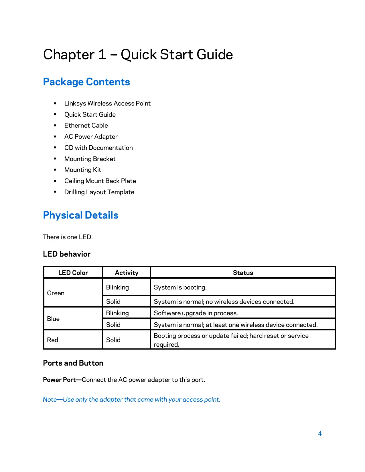 Ports and Button Power Port—Connect the AC power adapter to this port. Note—Use only the adapter that came with your access point.