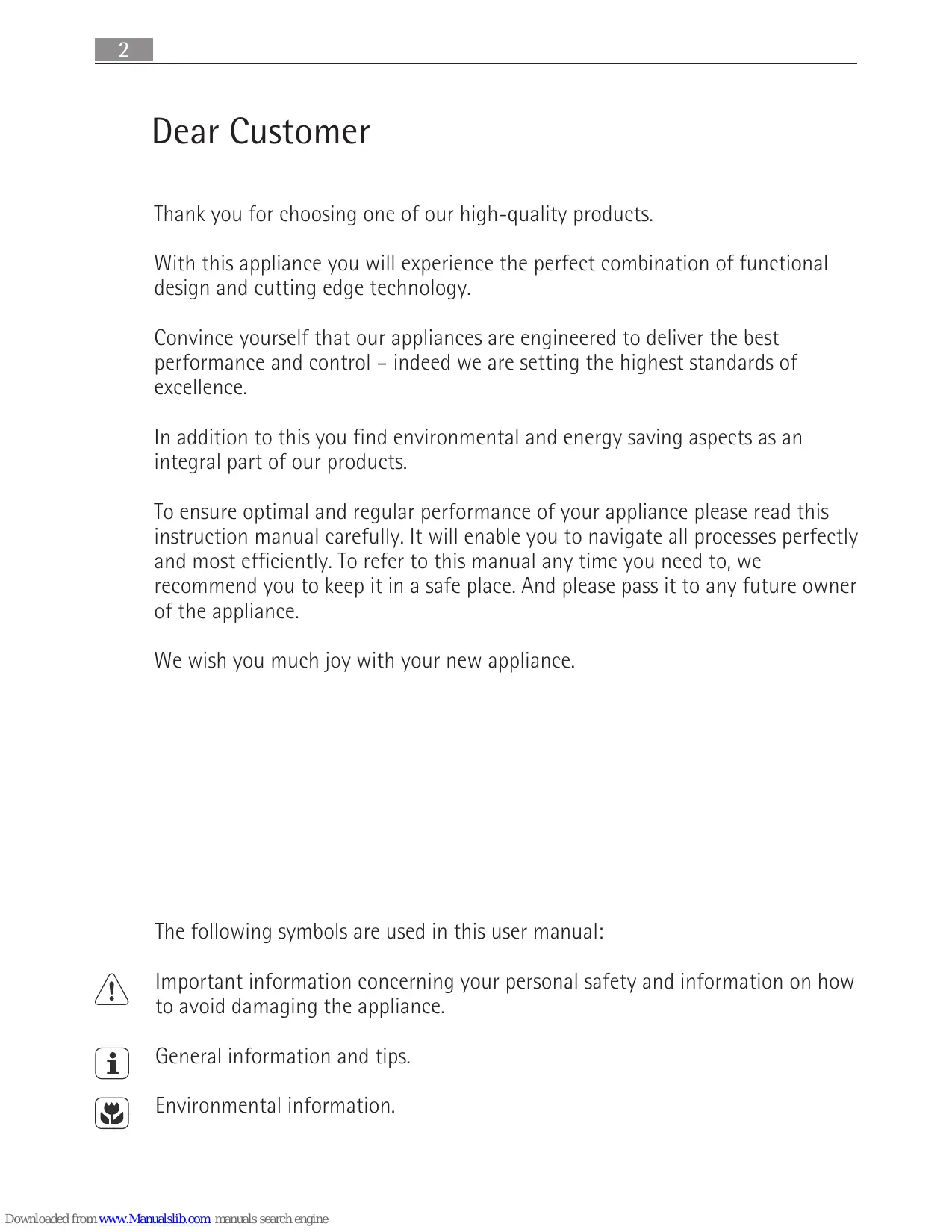Dear Customer Thank you for choosing one of our high-quality products. With this appliance you will experience the perfect combination of functional design and cutting edge technology. Convince yourself that our appliances are engineered to deliver the best performance and control – indeed we are setting the highest standards of excellence. In addition to this you find environmental and energy saving aspects as an integral part of our products. To ensure optimal and regular performance of your appliance please read this instruction manual carefully. It will enable you to navigate all processes perfectly and most efficiently. To refer to this manual any time you need to, we recommend you to keep it in a safe place. And please pass it to any future owner of the appliance. We wish you much joy with your new appliance. The following symbols are used in this user manual: Important information concerning your personal safety and information on how to avoid damaging the appliance. General information and tips. Environmental information. Downloaded from www.Manualslib.com manuals search engine Contents