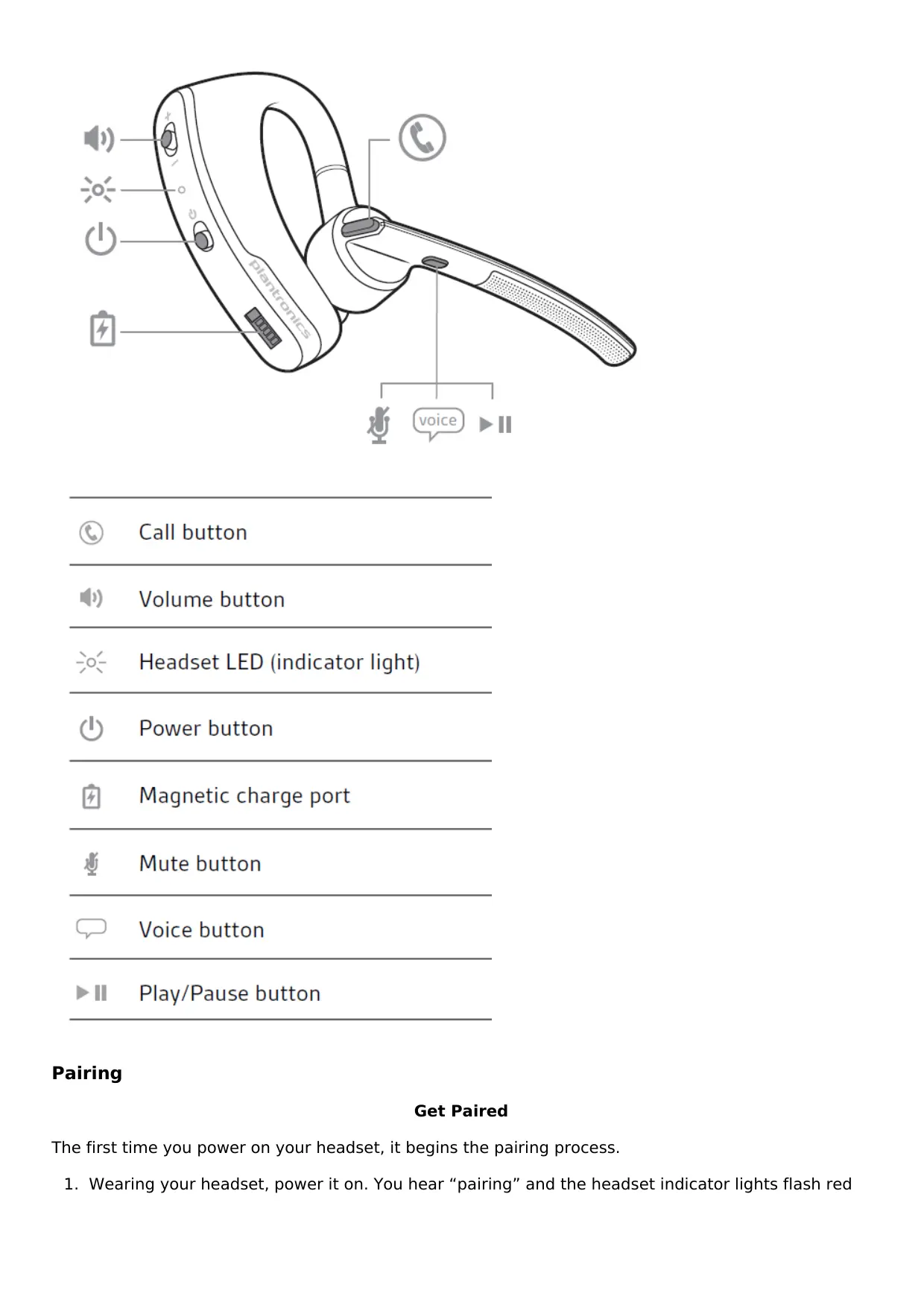 Portable charge case Desktop charge stand AC charger USB charge cable Car charge adapter Micro USB charge adapter Eartip kit (available in S, M, L) Headset Overview Pairing Get Paired The first time you power on your headset, it begins the pairing process.