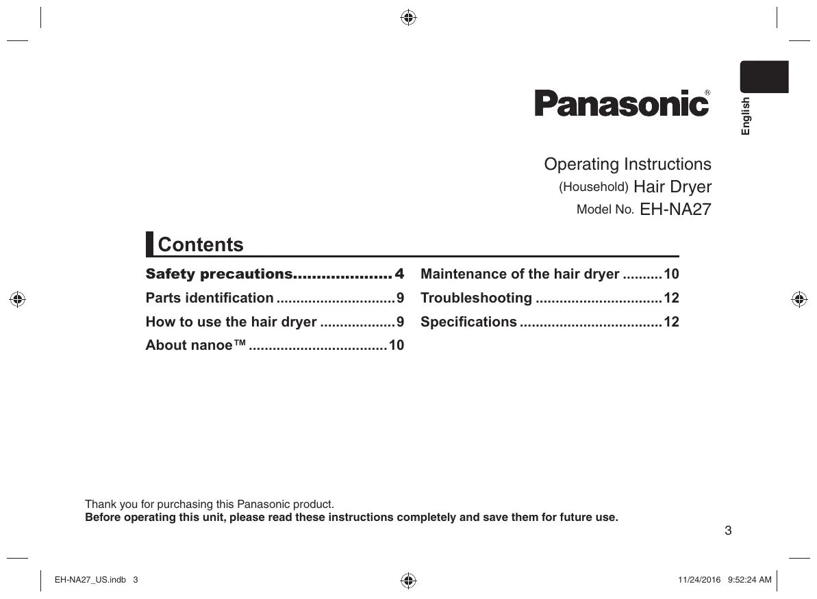 - Operating Instructions (Household) Hair Dryer Model No. EH-NA27 Operating Instructions (Household) Hair Dryer Model No. EH-NA27 Contents Safety precautions p. 4
