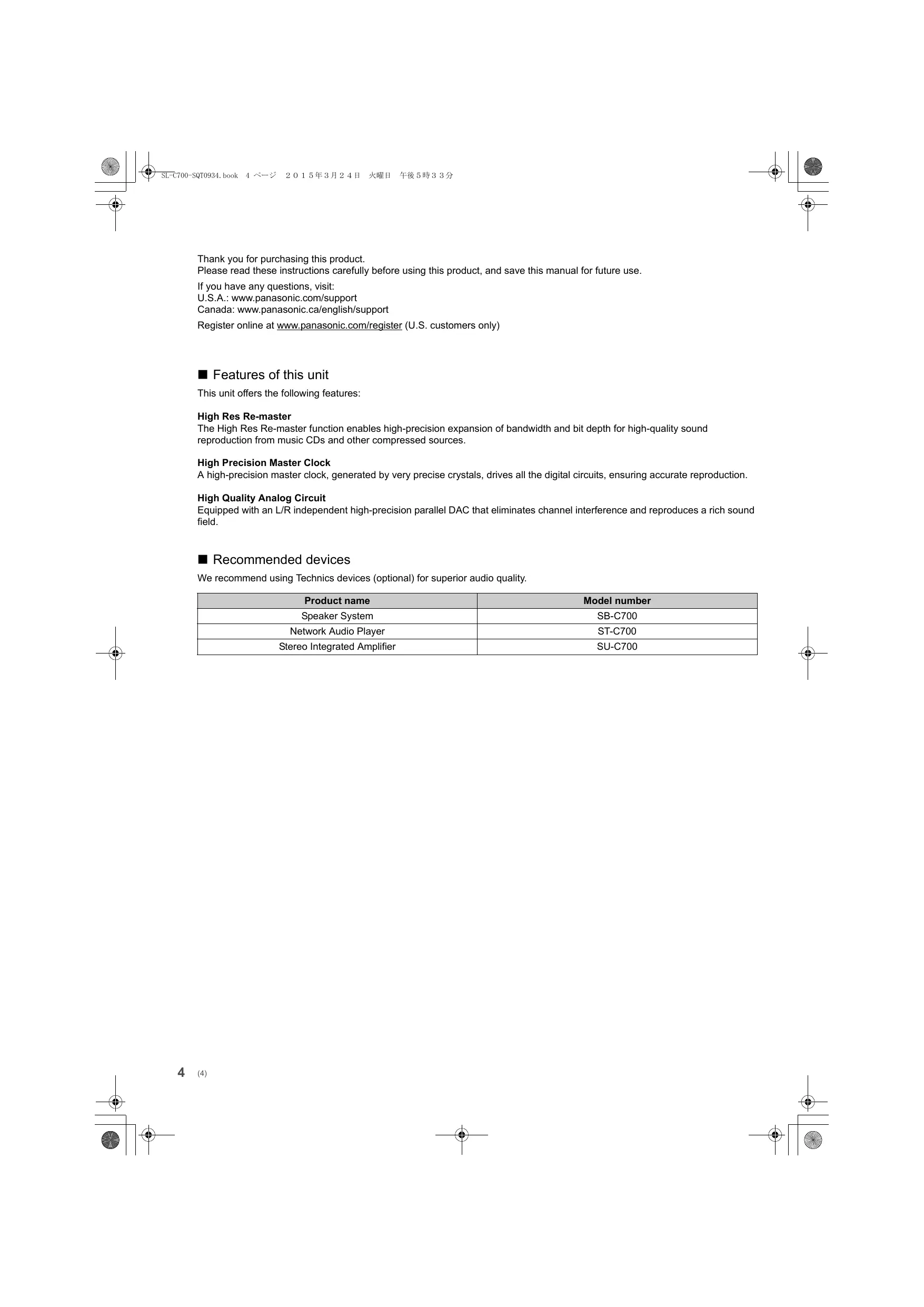 Thank you for purchasing this product. Please read these instructions carefully before using this product, and save this manual for future use. If you have any questions, visit: U.S.A.: www.panasonic.com/support Canada: www.panasonic.ca/english/support Register online at www.panasonic.com/register (U.S. customers only) ∫ Features of this unit This unit offers the following features: High Res Re-master The High Res Re-master function enables high-precision expansion of bandwidth and bit depth for high-quality sound reproduction from music CDs and other compressed sources. High Precision Master Clock A high-precision master clock, generated by very precise crystals, drives all the digital circuits, ensuring accurate reproduction. High Quality Analog Circuit Equipped with an L/R independent high-precision parallel DAC that eliminates channel interference and reproduces a rich sound field. ∫ Recommended devices We recommend using Technics devices (optional) for superior audio quality.