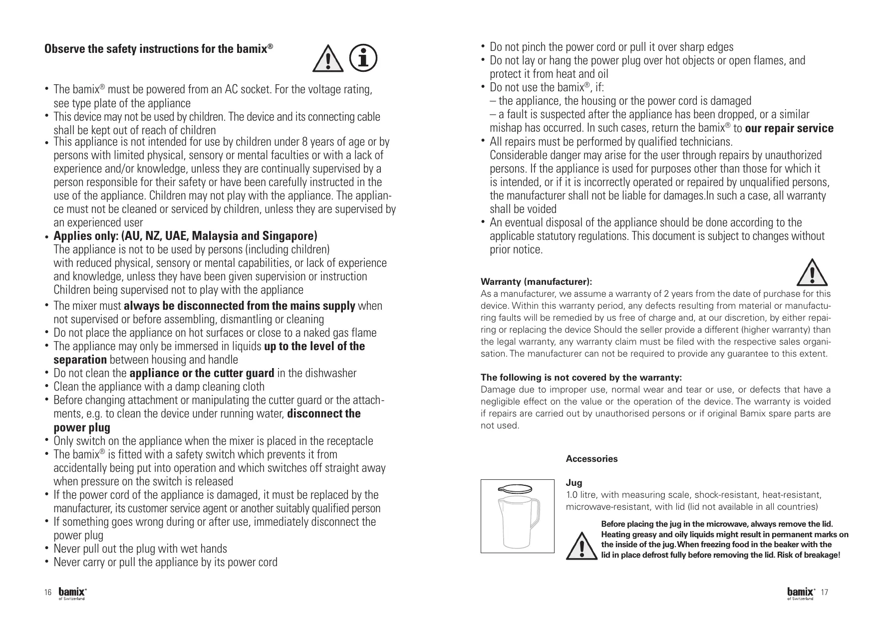 Do not pinch the power cord or pull it over sharp edges Do not lay or hang the power plug over hot objects or open flames, and protect it from heat and oil Do not use the bamix®, if: – the appliance, the housing or the power cord is damaged – a fault is suspected after the appliance has been dropped, or a similar mishap has occurred. In such cases, return the bamix® to our repair service All repairs must be performed by qualified technicians. Considerable danger may arise for the user through repairs by unauthorized persons. If the appliance is used for purposes other than those for which it is intended, or if it is incorrectly operated or repaired by unqualified persons, the manufacturer shall not be liable for damages.In such a case, all warranty shall be voided An eventual disposal of the appliance should be done according to the applicable statutory regulations. This document is subject to changes without prior notice. Warranty (manufacturer): As a manufacturer, we assume a warranty of 2 years from the date of purchase for this device. Within this warranty period, any defects resulting from material or manufacturing faults will be remedied by us free of charge and, at our discretion, by either repairing or replacing the device Should the seller provide a different (higher warranty) than the legal warranty, any warranty claim must be filed with the respective sales organisation. The manufacturer can not be required to provide any guarantee to this extent. The following is not covered by the warranty: Damage due to improper use, normal wear and tear or use, or defects that have a negligible effect on the value or the operation of the device. The warranty is voided if repairs are carried out by unauthorised persons or if original Bamix spare parts are not used. Accessories Jug