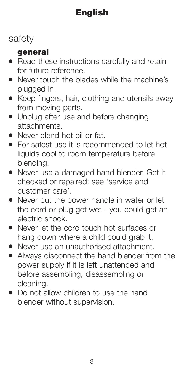 general Read these instructions carefully and retain for future reference. Never touch the blades while the machine’s plugged in. Keep fingers, hair, clothing and utensils away from moving parts. Unplug after use and before changing attachments. Never blend hot oil or fat. For safest use it is recommended to let hot liquids cool to room temperature before blending. Never use a damaged hand blender. Get it checked or repaired: see ‘service and customer care’. Never put the power handle in water or let the cord or plug get wet - you could get an electric shock. Never let the cord touch hot surfaces or hang down where a child could grab it. Never use an unauthorised attachment. Always disconnect the hand blender from the power supply if it is left unattended and before assembling, disassembling or cleaning. Do not allow children to use the hand blender without supervision.