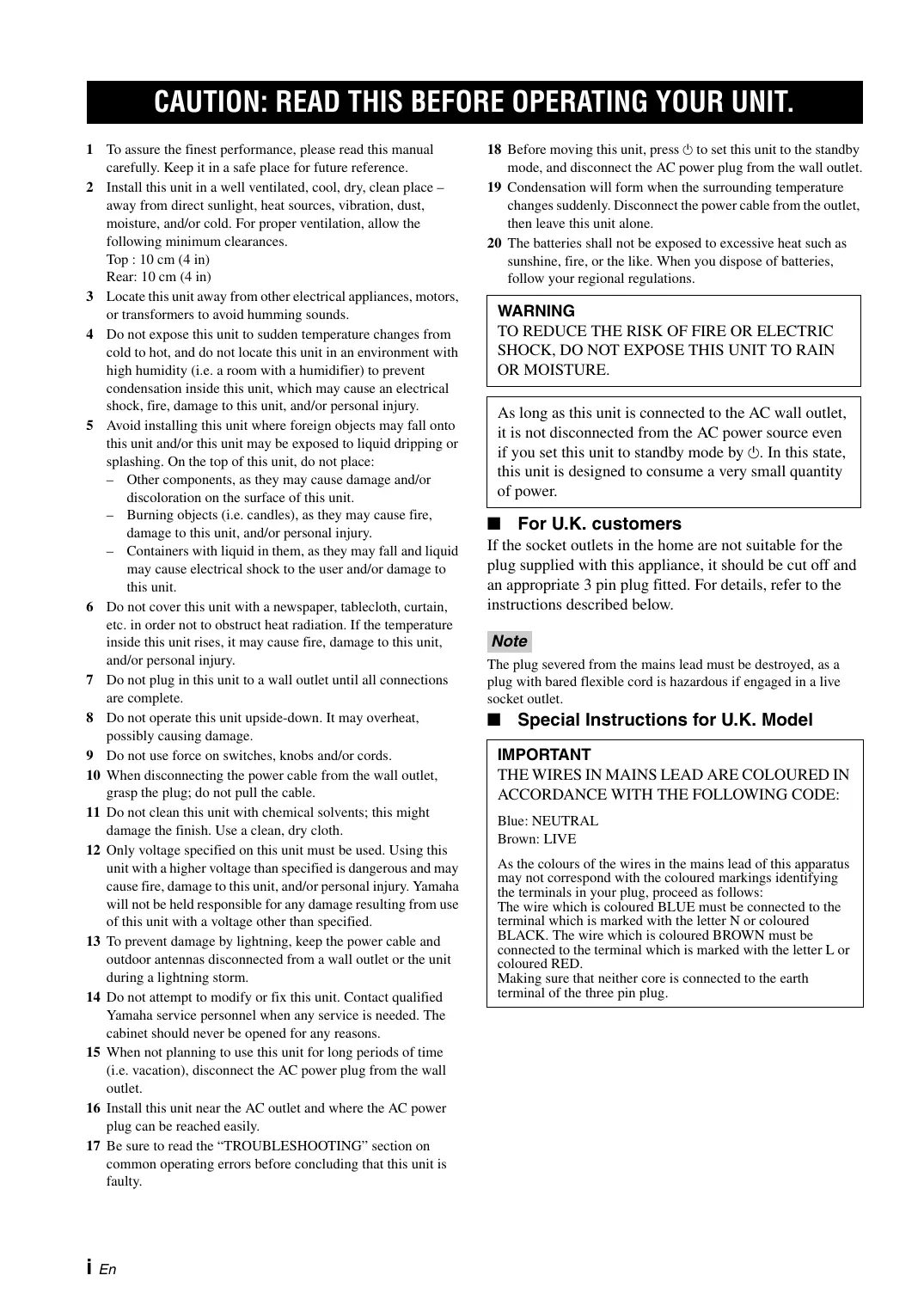 1 To assure the finest performance, please read this manual carefully. Keep it in a safe place for future reference. 2 Install this unit in a well ventilated, cool, dry, clean place – away from direct sunlight, heat sources, vibration, dust, moisture, and/or cold. For proper ventilation, allow the following minimum clearances. Top : 10 cm (4 in) Rear: 10 cm (4 in) 3 Locate this unit away from other electrical appliances, motors, or transformers to avoid humming sounds. 4 Do not expose this unit to sudden temperature changes from cold to hot, and do not locate this unit in an environment with high humidity (i.e. a room with a humidifier) to prevent condensation inside this unit, which may cause an electrical shock, fire, damage to this unit, and/or personal injury. 5 Avoid installing this unit where foreign objects may fall onto this unit and/or this unit may be exposed to liquid dripping or splashing. On the top of this unit, do not place: – Other components, as they may cause damage and/or discoloration on the surface of this unit. – Burning objects (i.e. candles), as they may cause fire, damage to this unit, and/or personal injury. – Containers with liquid in them, as they may fall and liquid may cause electrical shock to the user and/or damage to this unit. 6 Do not cover this unit with a newspaper, tablecloth, curtain, etc. in order not to obstruct heat radiation. If the temperature inside this unit rises, it may cause fire, damage to this unit, and/or personal injury. 7 Do not plug in this unit to a wall outlet until all connections are complete. 8 Do not operate this unit upside-down. It may overheat, possibly causing damage. 9 Do not use force on switches, knobs and/or cords. 10 When disconnecting the power cable from the wall outlet, grasp the plug; do not pull the cable. 11 Do not clean this unit with chemical solvents; this might damage the finish. Use a clean, dry cloth. 12 Only voltage specified on this unit must be used. Using this unit with a higher voltage than specified is dangerous and may cause fire, damage to this unit, and/or personal injury. Yamaha will not be held responsible for any damage resulting from use of this unit with a voltage other than specified. 13 To prevent damage by lightning, keep the power cable and outdoor antennas disconnected from a wall outlet or the unit during a lightning storm. 14 Do not attempt to modify or fix this unit. Contact qualified Yamaha service personnel when any service is needed. The cabinet should never be opened for any reasons. 15 When not planning to use this unit for long periods of time (i.e. vacation), disconnect the AC power plug from the wall outlet. 16 Install this unit near the AC outlet and where the AC power plug can be reached easily. 17 Be sure to read the “TROUBLESHOOTING” section on common operating errors before concluding that this unit is faulty.