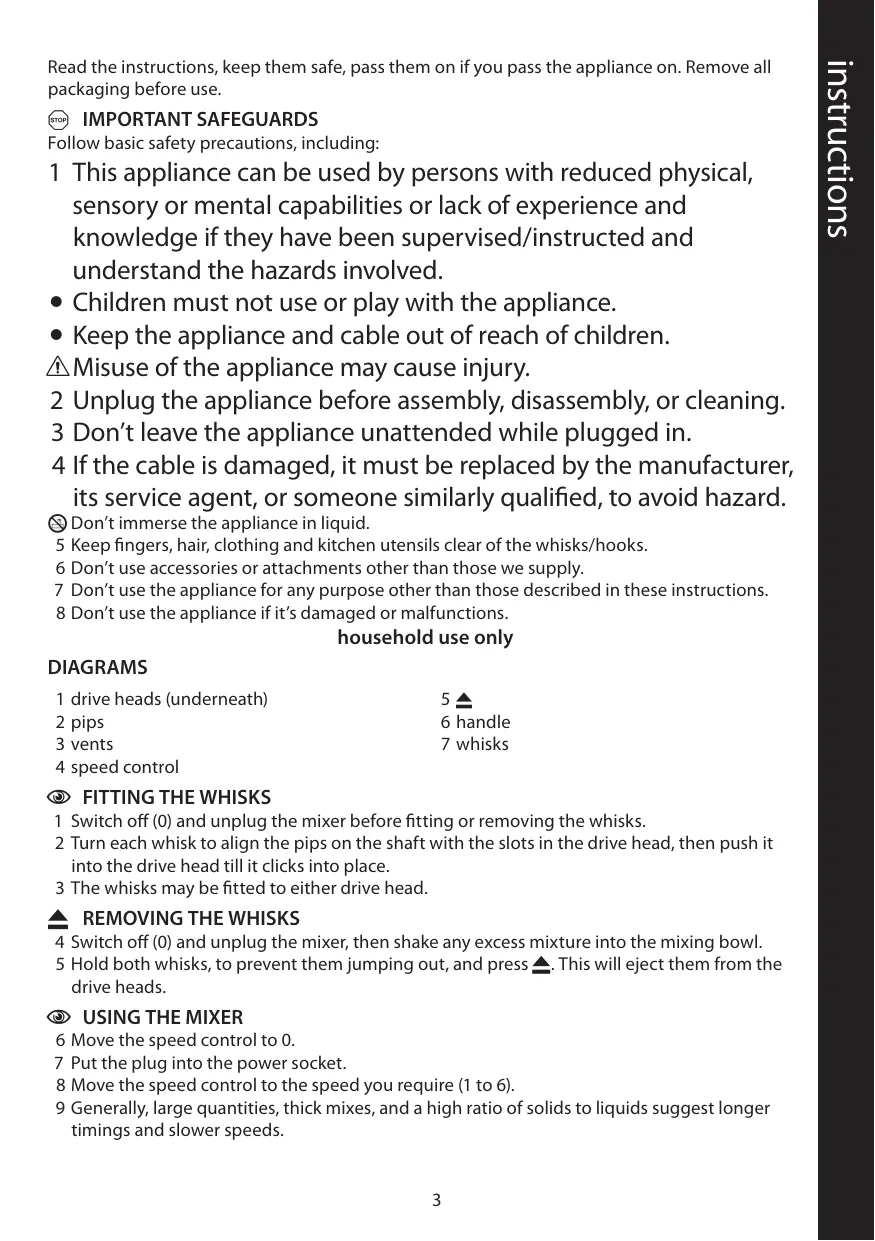 11 Use the whisks for beating/aerating light dough, batter, egg whites and cream. 12 If you need to set the mixer down, switch off (0), and shake any mixture off the whisks. 13 Don’t use the appliance continuously for more than 3 minutes. After 3 minutes use, let it rest for 5 minutes before carrying on. 14 If the motor starts to labour, add more liquid to the mix, if possible, or switch off and carry on by hand. 15 Move the speed control to 0 to switch off.